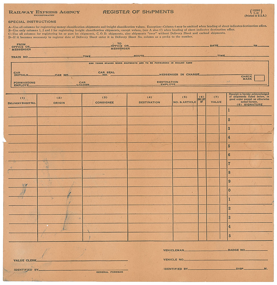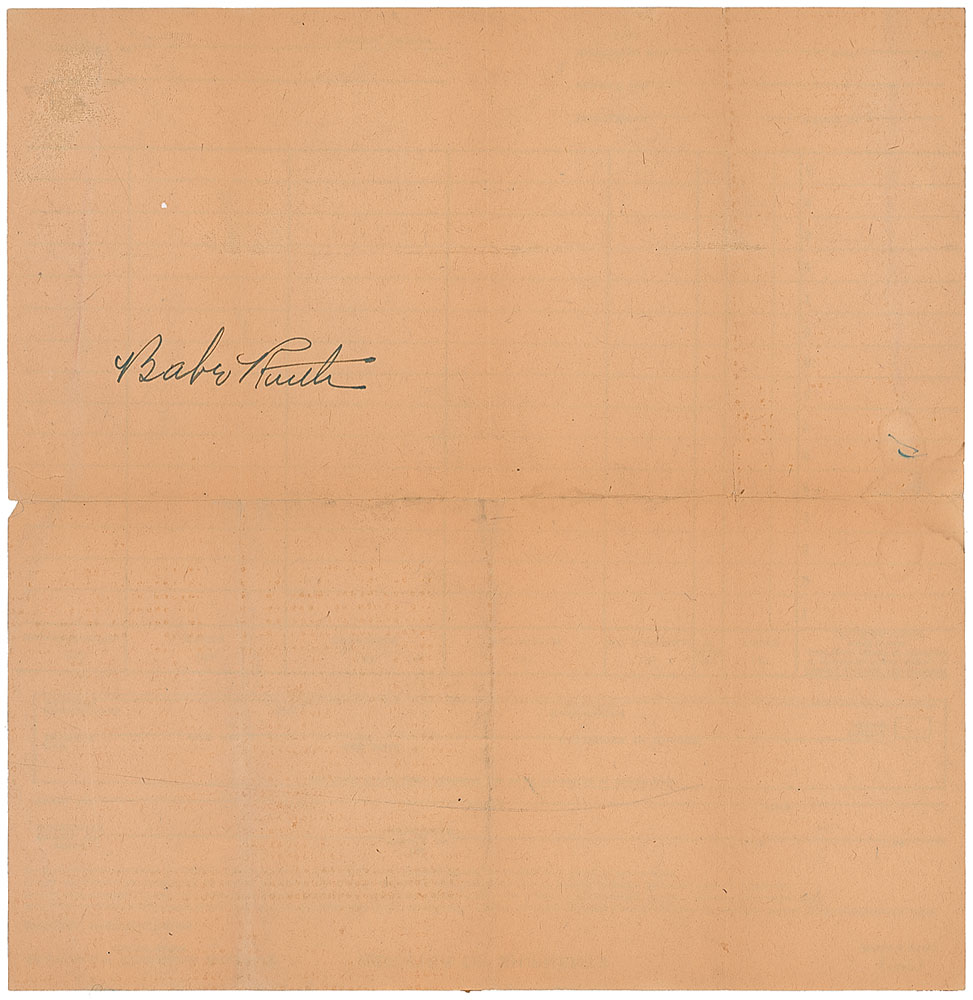 Vintage fountain pen signature, “Babe Ruth,” on the reverse of a blank 9 x 9.25 Railway Express Agency register of shipments form. Intersecting folds (one vertical fold passing through center of signature), overall toning, and a small tear to lower left, away from the signature, otherwise fine condition. Pre-certified Steve Grad/PSA/DNA and RR Auction COA.