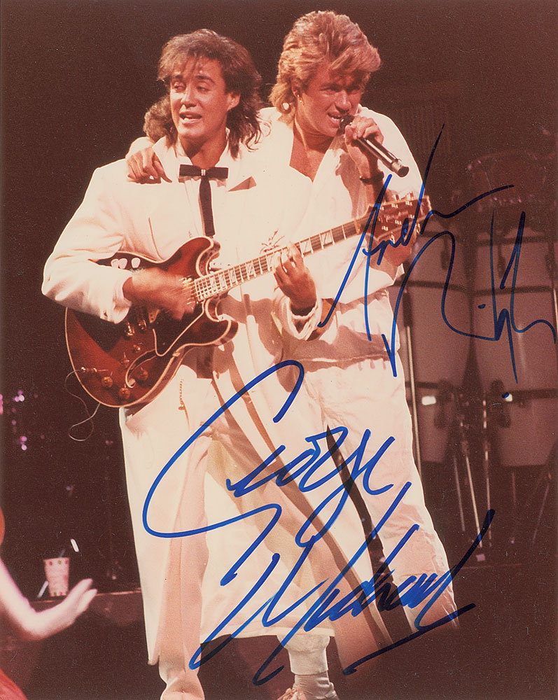 Color satin-finish 8 x 10 photo of the duo on stage, signed in person in blue felt tip by George Michael and Andrew Ridgeley. In very fine condition. Pre-certified Roger Epperson/REAL and RR Auction COA.