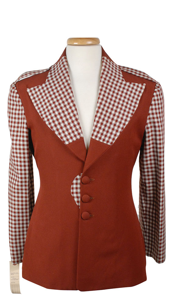 Brown’s personally-owned and -worn jacket with a brown and white checkered pattern on the collar and sleeves, no size or maker indicated. This jacket was sold as part of Lot 241 in the Christie’s auction of the James Brown Collection. In fine condition, with the Christie’s tag still affixed to one cuff. Provenance: The James Brown Collection, Christie’s, July 2008. Brown wore this style jacket in various colors during his 1978 tour. RR Auction COA.