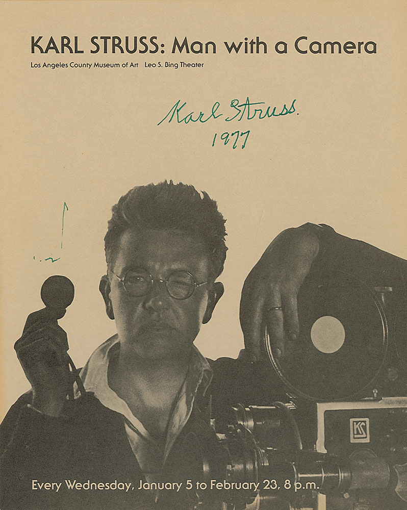 Photographer and cinematographer (1886–1981) and a pioneer in 3-D films. Fold-out program from the Los Angeles County Museum of Art, announcing a Struss exhibition entitled “Karl Struss: Man with a Camera,” from January 5–February 23, signed above his image in green felt tip, “Karl Struss 1977.” In fine condition. RR Auction COA.