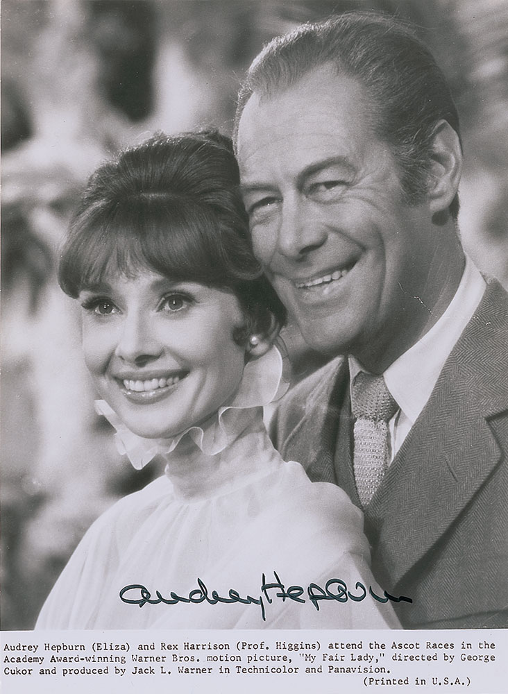 Glossy 7 x 9.5 Warner Bros. promotional photo of Hepburn and Rex Harrison for My Fair Lady, signed in black felt tip by Hepburn. In very good to fine condition, with trimmed edges and a crease to right side. Pre-certified PSA/DNA and RR Auction COA.