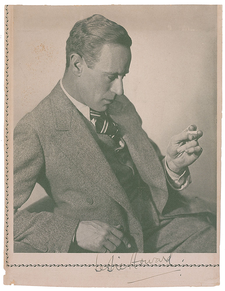 Vintage program photo of Howard from a production of Hamlet, trimmed to a size of 6.75 x 9, signed in the lower border in fountain pen. Trimmed edges, a few trivial edge tears and dings, and a bit of scattered light toning and foxing, otherwise fine condition. Accompanied by an unsigned program from Petrified Forest. Pre-certified PSA/DNA and RR Auction COA.