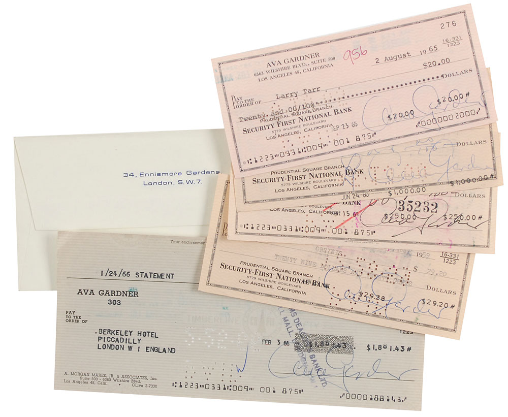 Five checks, ranging in date from 1959-1965, all signed by Gardner (with two also filled out in her hand). In very good condition, with cancellation stamps and holes to each check, with several over signatures. Accompanied by one of Gardner’s personal envelopes, with her London address embossed on the reverse. RR Auction COA.