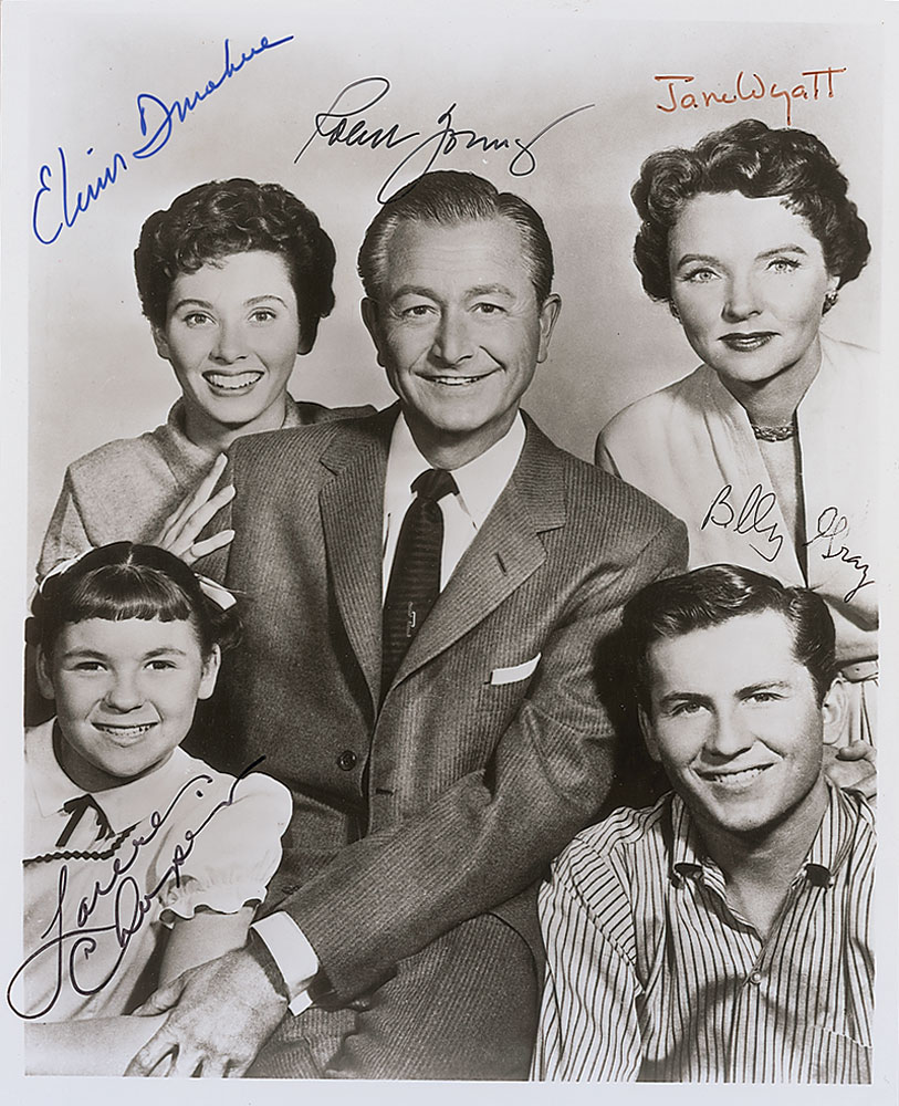 Glossy 8 x 10 cast photo of the Warren family, signed in various color felt tip by Robert Young, Jane Wyatt, Lauren Chapin, Elinor Donahue, and Billy Gray. In very fine condition. Pre-certified PSA/DNA and RR Auction COA.