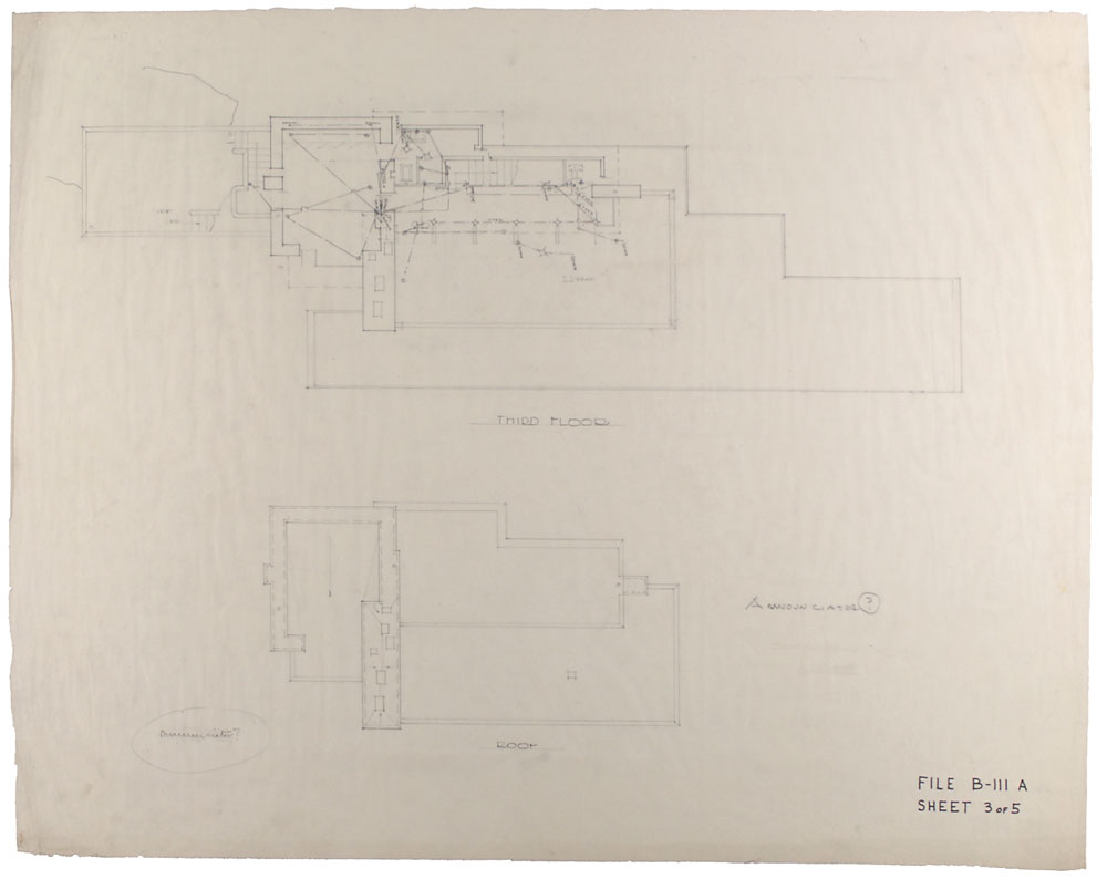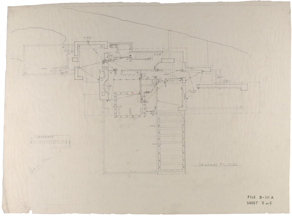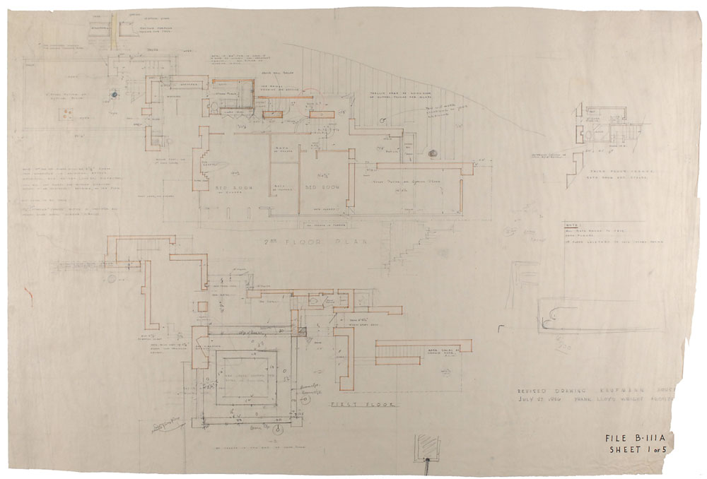 Incredibly rare set of five original pencil and colored pencil developmental architectural drawings of Wright's Fallingwater masterpiece, on large onionskin pages, each approximately 40 x 28, all done in an unknown hand, with the first page titled in pencil, "Revised Drawing Kaufmann House, July 27, 1936, Frank Lloyd Wright Architect," also in an unknown hand. Each page is also notated "File B-111A," and numbered one through five. Page one shows a remarkably detailed overhead view of the first and second floor plans of the home, all labeled with accurate measurements, with notes on the side indicating, "All bath rooms to have cork floors," and "1st floor lavatory to have stone paving." Several additional pencil sketches have been added to the first page as well, including a window, and staircase, again in an unknown hand, as well as several notations to individual areas of the drawing.
