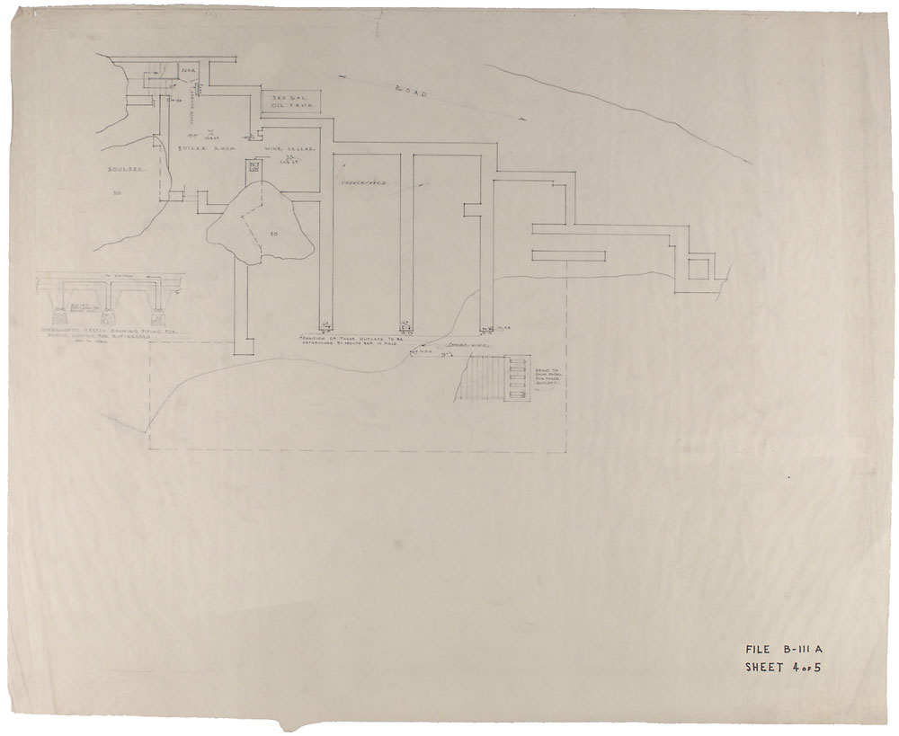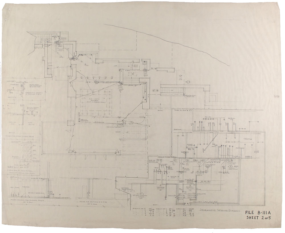 Second page is a detailed wiring schematic of the entire home, listing 15 different circuits. Third page shows an overhead view of roof and third floor, with the fourth page showing details of the basement, complete with boulders, a wine cellar and boiler room, with the shore line of Bear Run added to the bottom portion of the drawing, and the final page shows an overhead view of the second floor. Rolled and in overall fine condition, with some paper loss to lower right corner of first page, expected handling wear and soiling, and some scattered light creases and short edge tears.