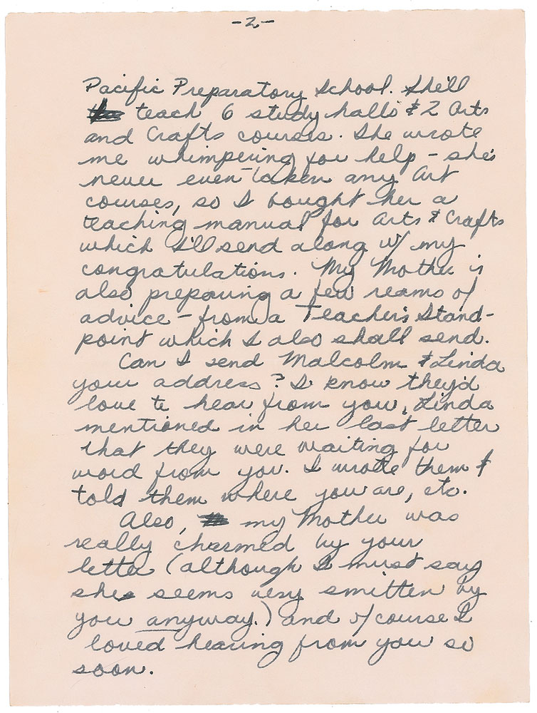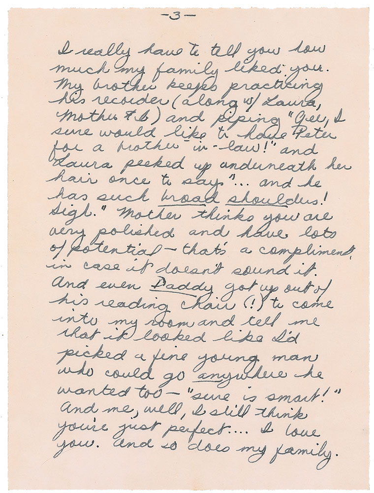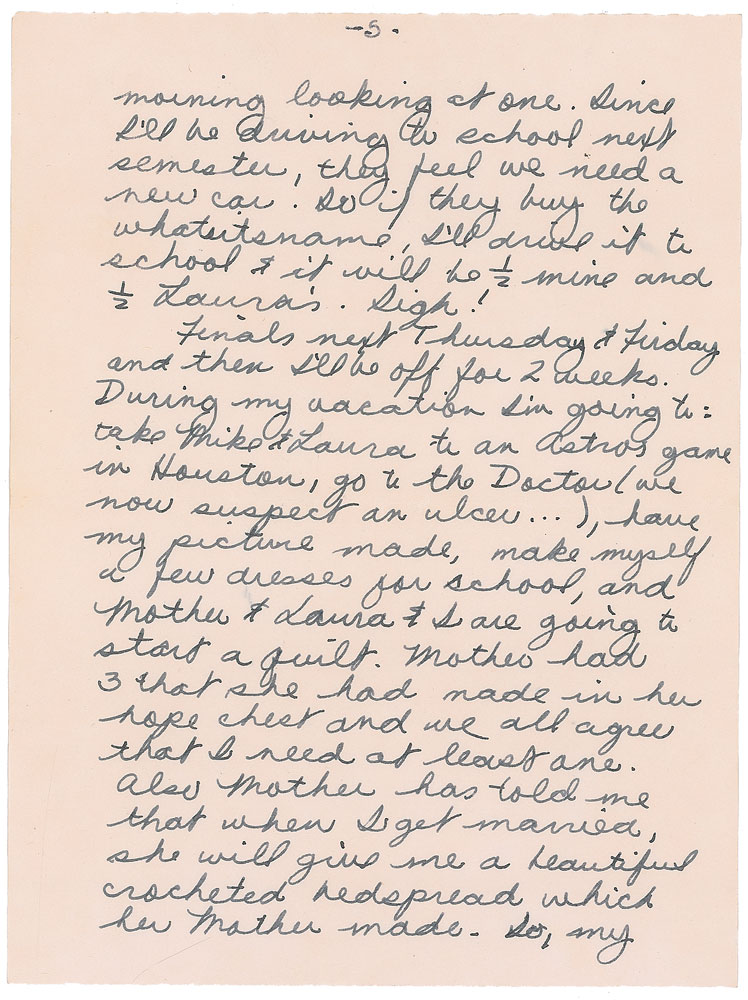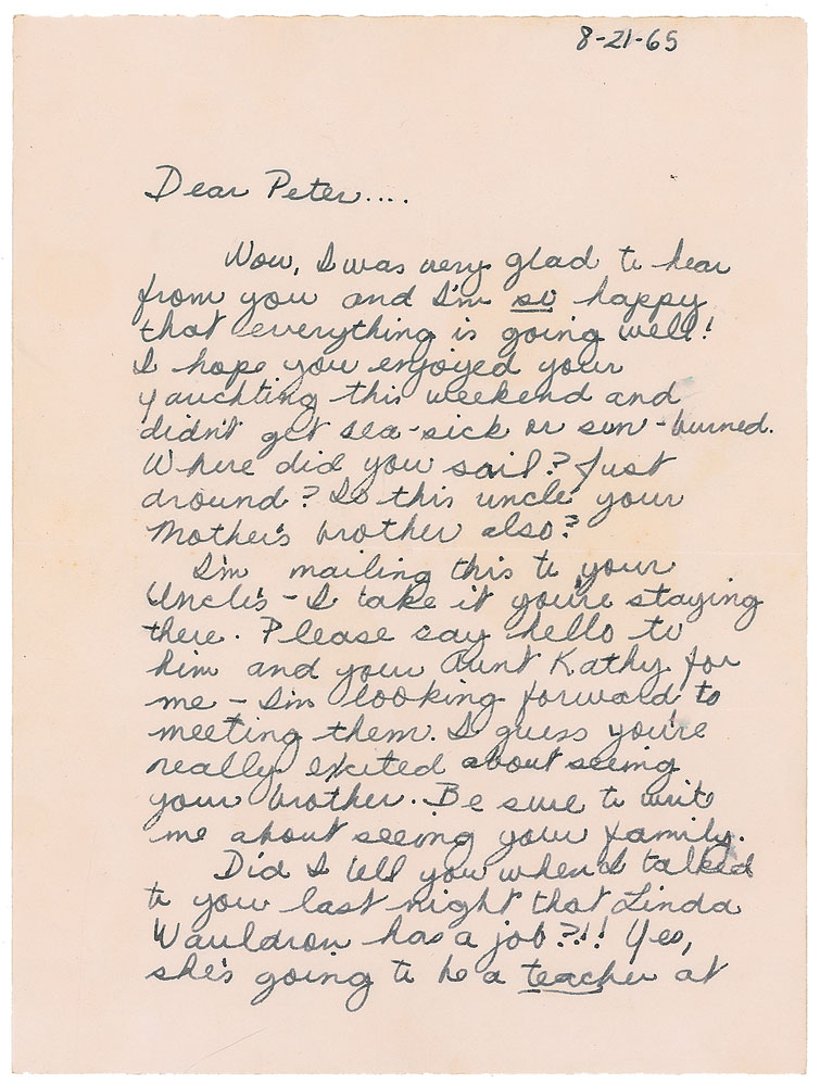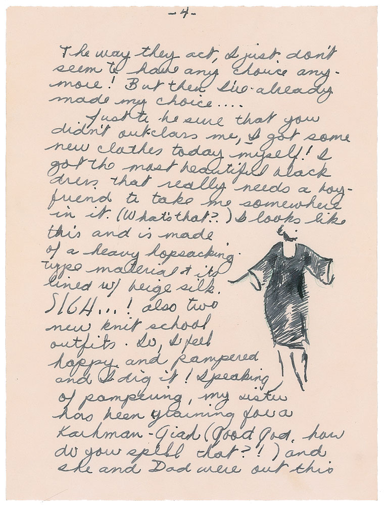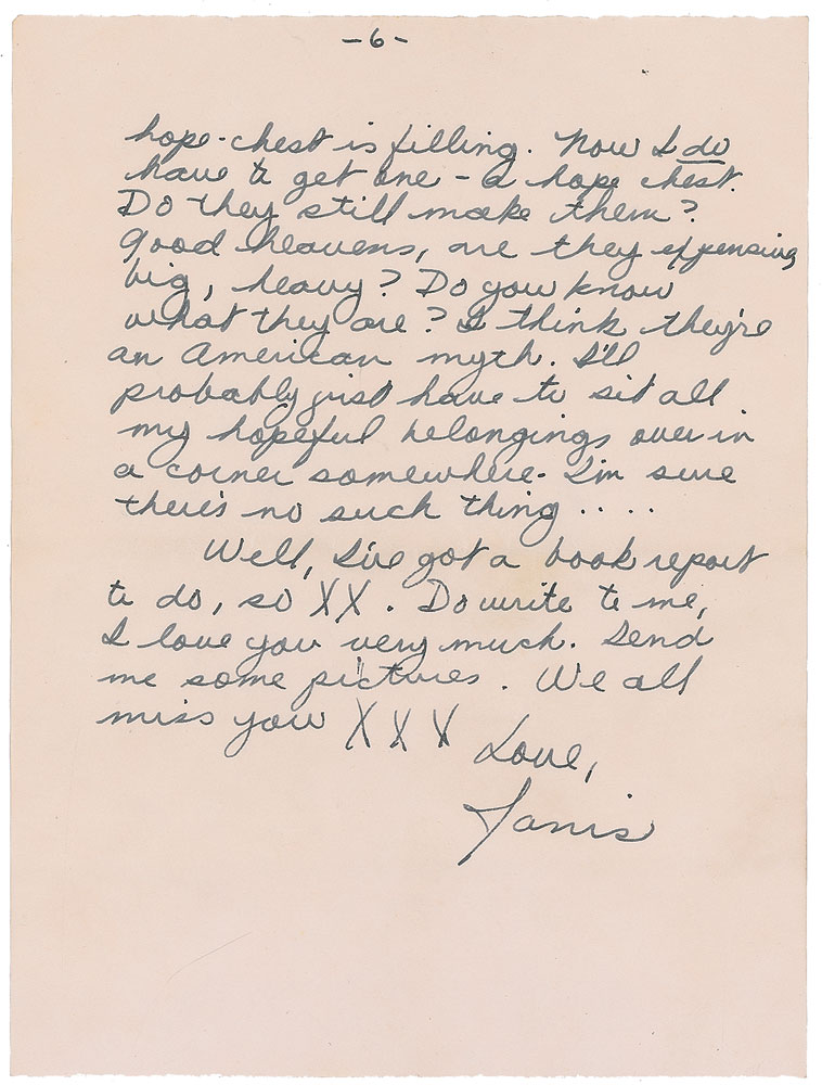 ALS signed “Love, Janis,” six pages, 6 x 8, August 21, 1965. Letter to her boyfriend Peter DeBlanc. In part: “My mother was really charmed by your letter (although I must say she seems very smitten by you anyway) and of course I loved hearing from you so soon. I really have to tell you how much my family liked you. My brother keeps practising his recorder (along w/Laura, Mother & I) and piping 'Gee, I sure would like to have Peter for a brother-in-law!’ and Laura peeked up underneath her hair once to say ‘…and he has such broad shoulders! Sigh.’ Mother thinks you are very polished and have lots of potential—that’s a compliment in case it doesn’t sound it. And even Daddy got up out of his reading chair(!) to come into my room and tell me that it looked like I picked a fine young man who could go anywhere he wanted to ‘sure is smart!’ And me, well, I still think you’re just perfect…I love you. And so does my family…Just be sure that you don’t outclass me, I got some new clothes today myself! I got the most beautiful black dress that really needs a boyfriend to take me somewhere in it. (What’s that?) & looks like this and is made of a heavy hopsacking type material & its lined w/ beige silk. SIGH! [next to this portion of the letter, Joplin has added a full-length sketch of the dress on a female figure]…So I feel happy and pampered and I dig it!…I’ll be off for 2 weeks. During my vacation I’m going to take Mike & Laura to an Astros game in Houston, go to the Doctor (we now suspect an ulcer) have my picture made, make myself a few dresses for school, and Mother & Laura & I are going to start a quilt…So my hope chest is filling…Well, I’ve got a book report to do, so XX. Do write to me, I love you very much. Send me some pictures. We all miss you XXX.” In fine condition.