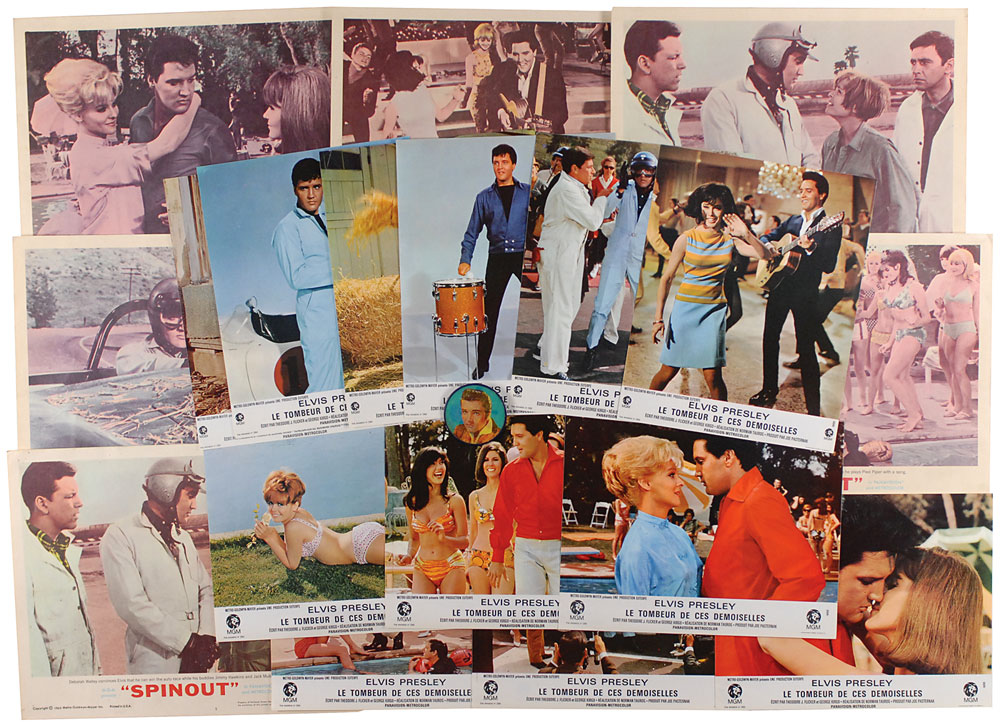 Collection of promotional material for Presley’s 1966 film Spinout, consisting of seven color 14 x 11 lobby cards and two different sets of six color 11 x 8.5 and 8.5 x 11 magazine-stock French photos for Le tombeur de ces dames [Spinout]. Also included is a vintage color 2.5″ diameter hologram pin, with a 1959 Elvis Presley Enterprises copyright stamp on the reverse. In overall fine condition, with various creases and tack holes to lobby cards. Both sets of photos are accompanied by their original envelopes. RR Auction COA.