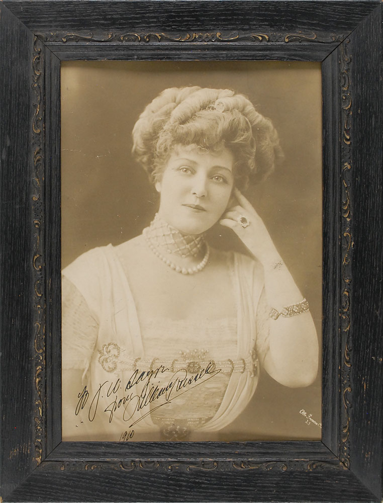 Actress and singer (1860–1922) who became one of the most famous performers of the late 19th and early 20th centuries. Lovely vintage glossy 8.25 x 12 half-length photo of Russell in a dazzling outfit, signed and inscribed in black ink, “To J. W. Sayre, from Lillian Russell, 1910.” Framed to an overall size of 12 x 16. In fine condition, with a few slight surface marks and creases, and two tack holes to the lower left corner. Pre-certified PSA/DNA and RR Auction COA.
