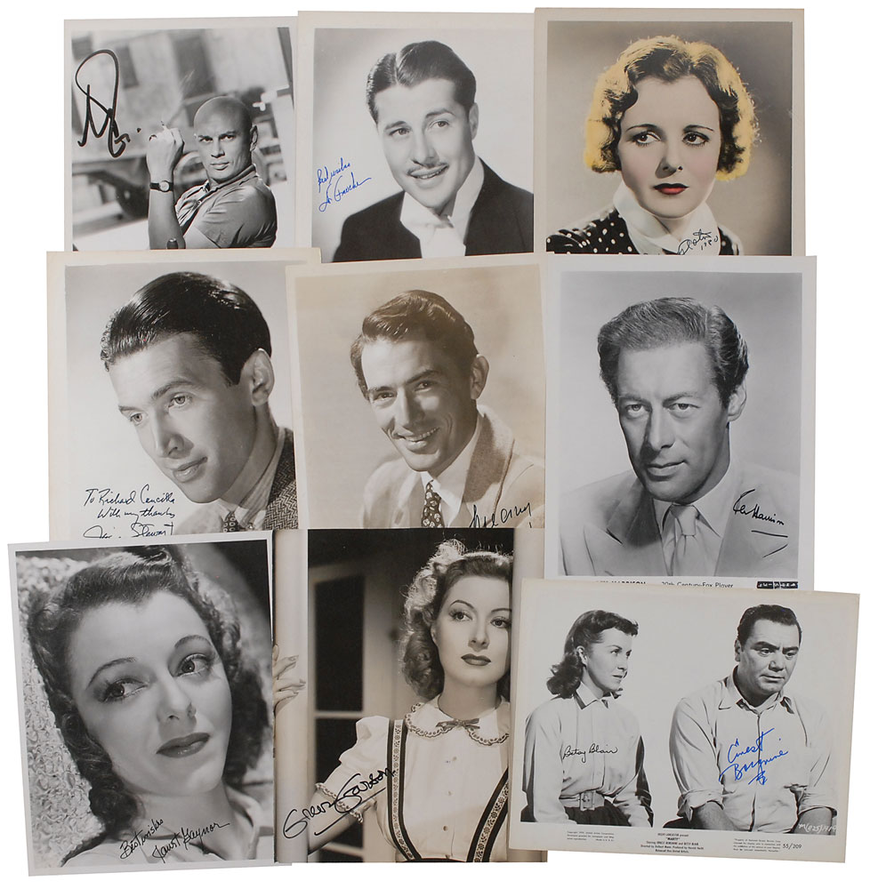Nine photos, eight 8 x 10 and one 10 x 8, various finishes, each signed in ink or felt tip by the Academy Award–winning actor or actress pictured. Signers are: James Stewart (ins), Don Ameche, Mary Astor, Yul Brynner, Greer Garson, Janet Gaynor, Rex Harrison, Gregory Peck, and Ernest Borgnine (also signed by Betsy Blair). In fine condition, with some scattered creases. RR Auction COA.