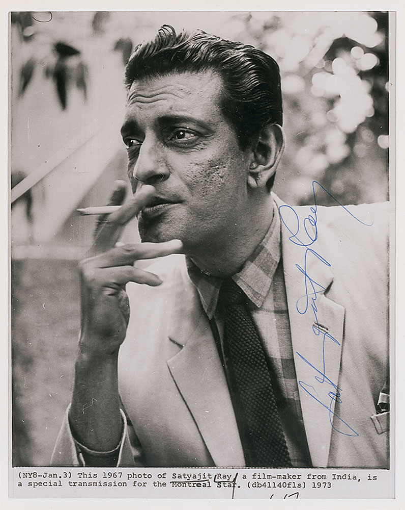 Indian filmmaker (1921–1992) regarded as one of the greatest auteurs of 20th century cinema. Glossy 8 x 10 photo of Ray taking a drag on his cigarette, signed vertically in blue ballpoint. In fine condition. Pre-certified PSA/DNA and RR Auction COA.