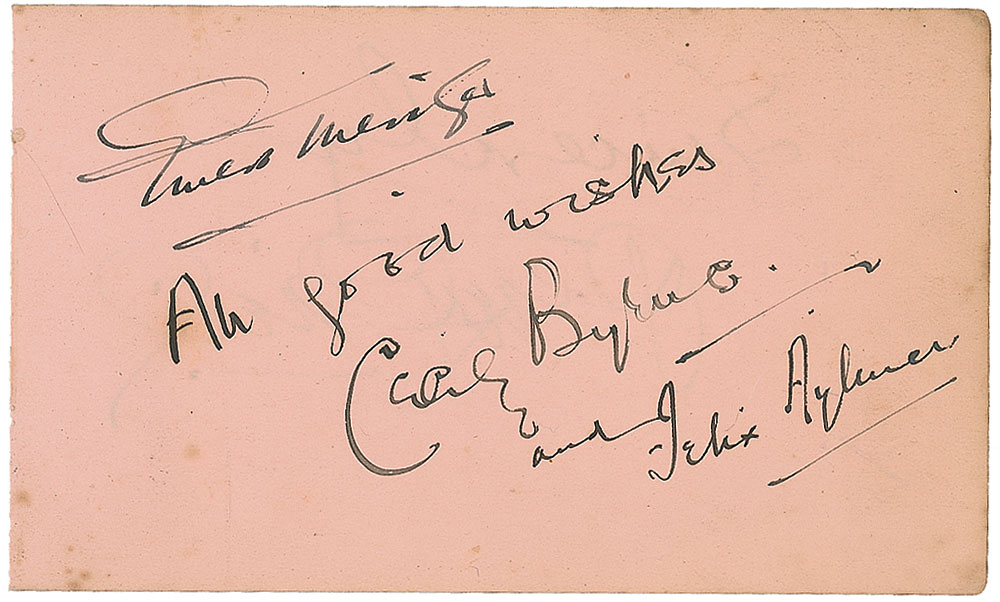 Character actor (1879–1961) best remembered as the mad scientist Dr. Pretorius in The Bride of Frankenstein. Vintage fountain pen signature, “Ernest Thesiger,” on a light pink 5.25 x 3.25 album page, also signed by Felix Aylmer and one other. Some scattered light toning and foxing, otherwise fine condition. Accompanied by an unsigned vintage glossy 8 x 10 portrait. Pre-certified PSA/DNA and RR Auction COA.