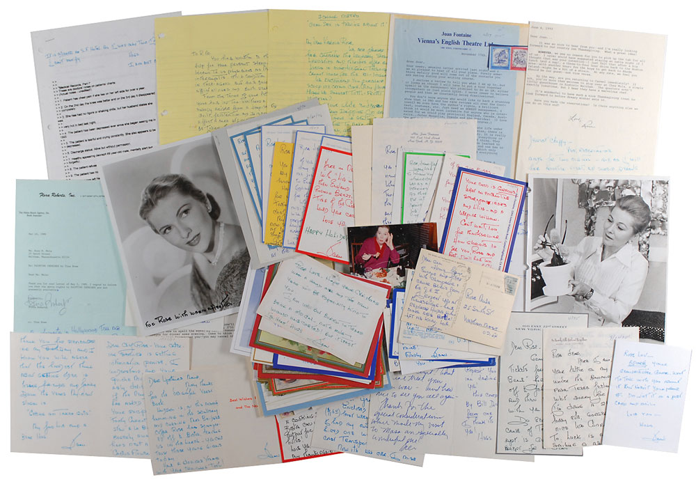 Massive archive of correspondence from Fontaine to Rose Mula, consisting of 60 ALSs on various stationery, postcards, and personal note cards, two TLSs, a signed photo, and 26 holiday cards for occasions like Christmas and Valentine’s Day, dating from June 1975 to January 2000, with additional birthday cards extending into 2010; most items are intimately signed “Joan,” with a few signed “JF” and “Joan F.” Also included are some of the original letters to Fontaine, to which she has added various comments, notes, and replies, often quite humorous. One such letter from Mula comments on Gone With the Wind, in part (with Mula’s typed letter in brackets): “[Re Olivia is she actually writing her memoirs] For the last 30 years! [And do you think she really is buried in fan mail?] Unanswered—for the last 30 years…Keep the laffs comin’!” In a lengthy autograph note, Fontaine pens an ‘article’ entitled “School Motto: ‘Oral Sex is Talking About It,’” in part: “We are pleased that you have contacted the Lewinsky School of Linguistics…We recommend you purchase a two-scoop ice cream cone…Next your whole endeavor s to keep the cone from dripping. In order to do this the tongue is gently applied…Yet there is the every-day hum-drum circular motion frequently known as the ‘missionary mastication.’” In another, Fontaine writes, “From the tenor of your letter I suspect you have lied too-sheltered a life and your malady arises from a deep-seated sense of guilt, frustration and disappointment…I suggest the following: Purchase a two-piece red sweat suit and have the message below stenciled on the front: [affixed newspaper clipping: ‘I’m Still A Virgin’]. Drop in, occasionally, at your local singles bar. Soon, I believe, you will be sleeping like a top and with a smile on your face.” In another, she references the characters in the classic film Rebecca: “The Bronxville maid was ‘I’ de Winter. You found Rebecca’s closet. Maxim’s shaving brush—and Mrs. Danvers’ is in the attic.” Many of Fontaine’s letters are affixed to scrapbook pages with photocopies of any other pages affixed to the opposing side. The archive also contains retained copies of Mula’s letters to Fontaine, providing complete context for Fontaine’s letters. In addition, there are candid photos of Mula’s trip to California to visit Fontaine, including a photo of her holding her friend’s Academy Award, as well as photos of Fontaine’s gardens. In overall fine condition. Mula was first introduced to Fontaine as a young girl in 1940, enthralled by her performance on the big screen as Mrs. de Winter in Alfred Hitchcock’s classic Rebecca. It wasn’t, however, until decades later that she got to meet the idol of her childhood in person, when Fontaine arrived in New England in 1975 to star in Cactus Flower at Chateau de Ville, a small theatre chain that Mula managed. The two stuck a remarkable friendship, visiting each other several times, speaking on the phone, and—clearly—exchanging letters. Though she was at first awed to be corresponding with ‘Joan Fontaine! Movie Star!’ Mula soon forgot about Fontaine’s celebrity status and began to think of her as simply Joan, her treasured friend—charming, generous, unpretentious, and hilarious. A superb, one-of-a-kind grouping of correspondence rich with fascinating tidbits, stories, quips, and jokes that provide great insight into Fontaine’s magnetic personality and the inner workings of a close friendship. RR Auction COA.