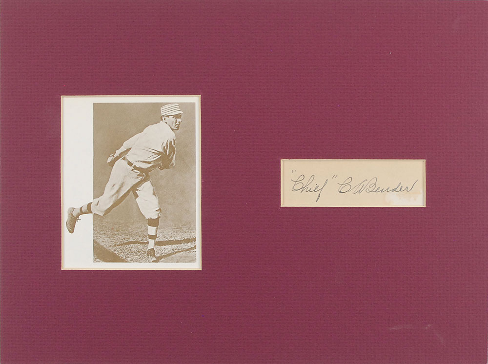 Much-lauded baseball pitcher (1884–1954) inducted into the Hall of Fame in 1953, a year before his death. Vintage fountain pen signature, “‘Chief’ C A Bender,” on an off-white album page. Matted with a printed photo of Bender in uniform to an overall size of 12 x 9. In fine condition, with some slight surface loss under last name of signature. Pre-certified Steve Grad/PSA/DNA and RR Auction COA.