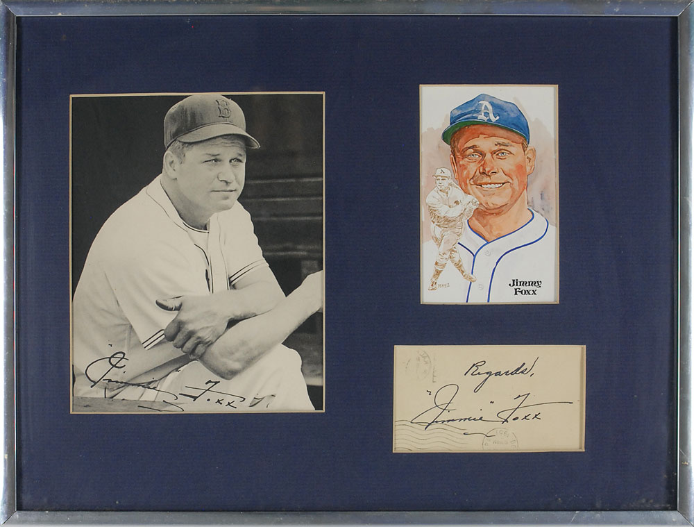 Vintage fountain pen signature, “Regards, Jimmie Foxx,” on an off-white government postcard (postmarked 10/30/1951). Matted and framed with a Perez-Steele card and photo of Foxx in his uniform (bearing a pre-printed signature) to an overall size of 16.5 x 12.5. In fine condition, with two postal cancellations around signature. Pre-certified Steve Grad/PSA/DNA and RR Auction COA.
