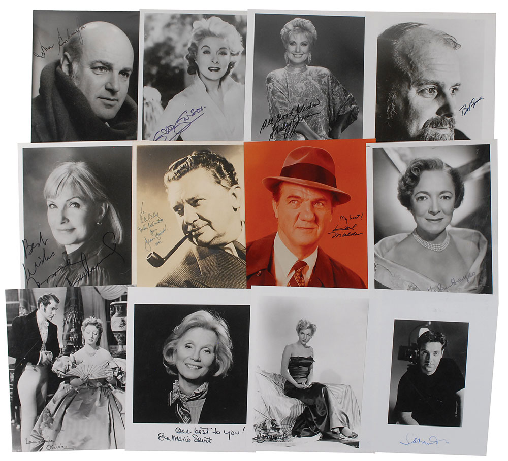 Collection of 12 photos, all 8 x 10, various finishes, each signed in felt tip or ink by the Academy Award-winning actor or actress pictured. Signers are: Jean Hersholt (vintage ins.), Karl Malden, Sam Mendes, Bob Fosse, John Schlesinger, Laurence Olivier, Greer Garson, Joanne Woodward, Helen Hayes, Shirley Jones, Eva Marie Saint, and Joan Fontaine. In overall fine condition. RR Auction COA.