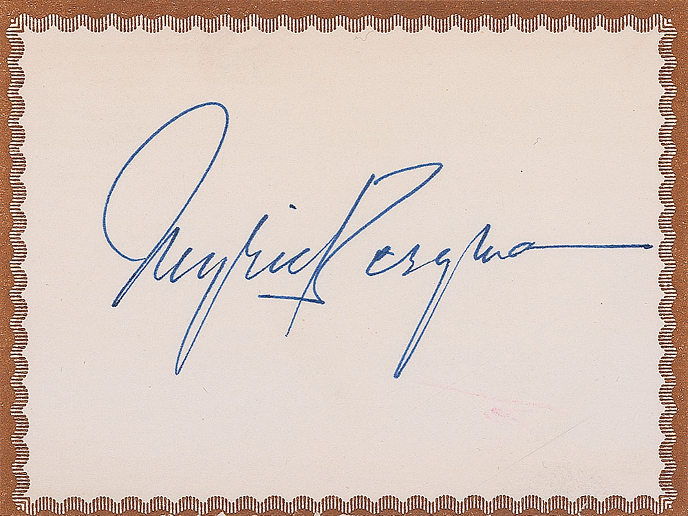 Vintage fountain pen signature, “Ingrid Bergman,” on an off-white 4 x 3 sheet. In fine condition. Accompanied by an unsigned vintage glossy 8 x 10 photo of Bergman sitting in a patio chair. Pre-certified PSA/DNA and RR Auction COA.