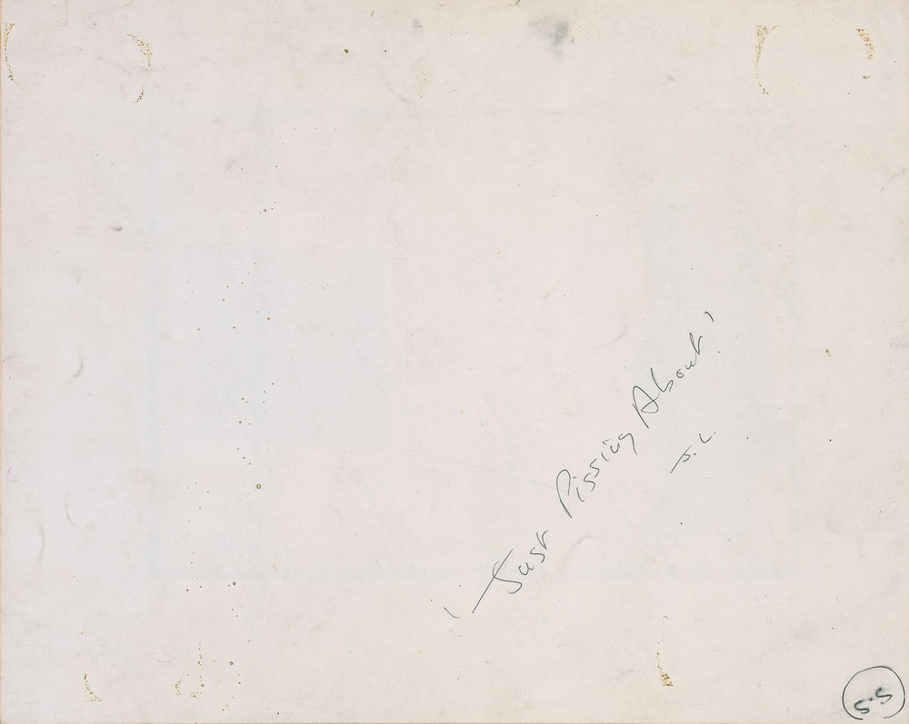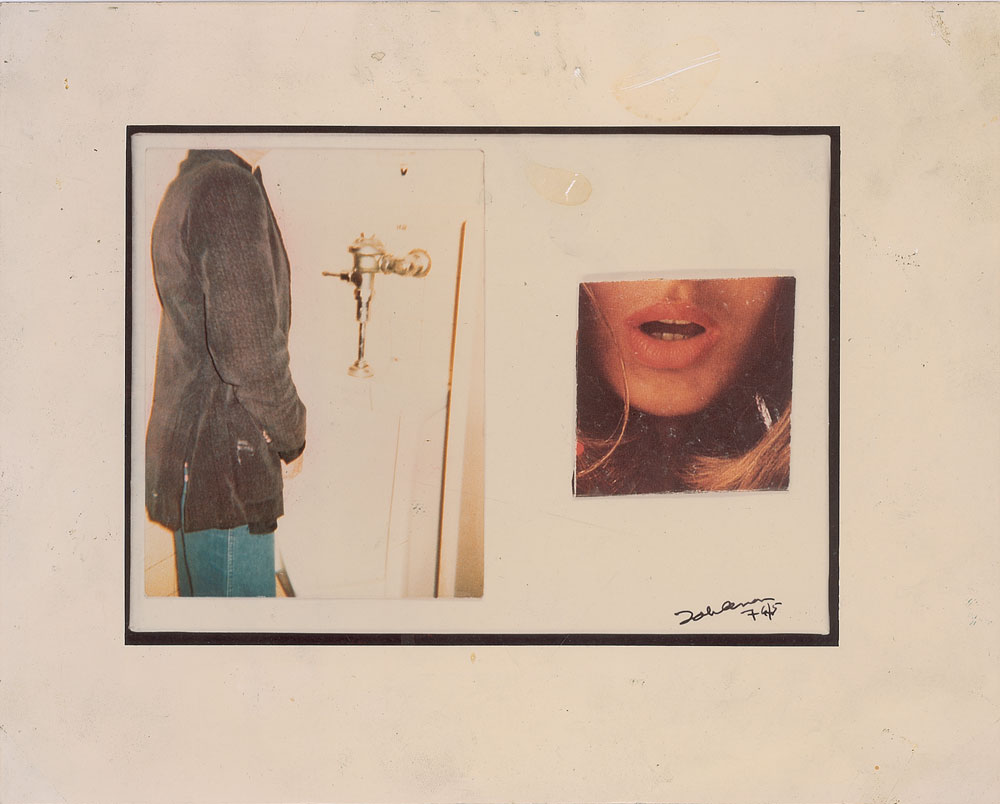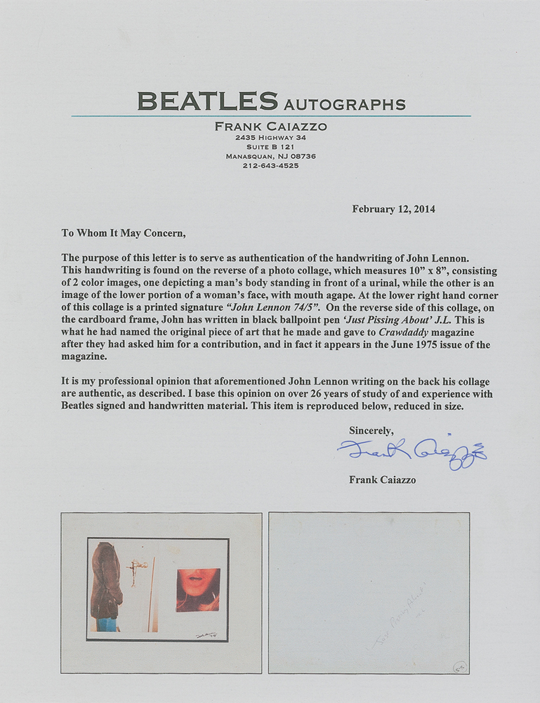 Color satin-finish 10 x 8 photo of a photo collage of a man standing at a urinal and the lower portion of a woman’s face, with Lennon’s printed signature in the corner, signed on the reverse in black ballpoint, “‘Just Pissing About’ J. L.” A small tear to top edge, scattered soiling to image side, with only slight soiling to the reverse, otherwise fine condition. Accompanied by a certificate of authenticity from Beatles expert Frank Caiazzo. This image was featured in the June 1975 issue of Crawdaddy magazine, as part of a collection of poems and essays contributed by various celebrities on the topic of growing up. Other contributors included Muhammad Ali, Rodney Dangerfield, Chris Hillman, and Patti Smith. Pre-certified Roger Epperson/REAL and RR Auction COA.