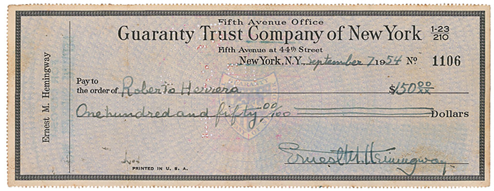 Personal check, 8.5 x 3.25, filled out in another hand and signed by Hemingway, “Ernest M. Hemingway,” payable to Roberto Herrera for $150, September 7, 1954. Endorsed on the reverse by Herrera, who was Hemingway’s close friend, part-time secretary, and brother of his Cuban doctor. Expected cancellation holes and light staining affecting end of signature, otherwise fine condition. Pre-certified PSA/DNA and RR Auction COA.