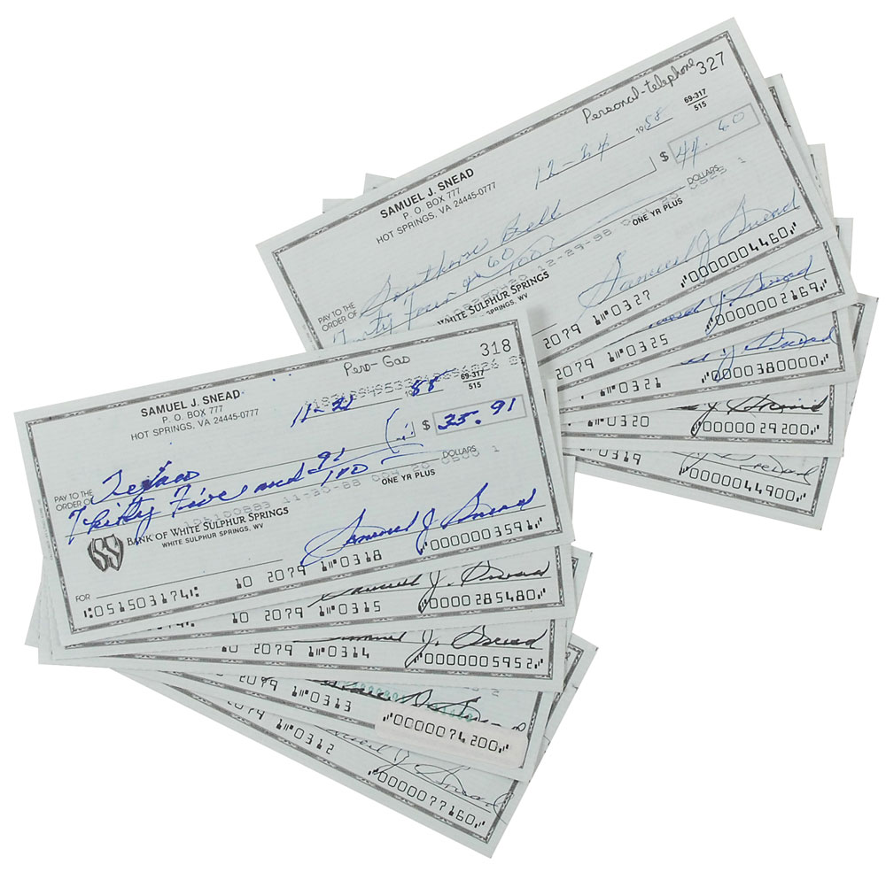 Collection of 10 personal checks, 6 x 2.75, all filled out and signed by Snead, “Samuel J. Snead,” all dated from 1988. In fine condition, with expected bank stamps, lightly affecting a couple of signatures, and vertical folds to some. RR Auction COA.