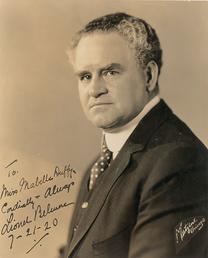 English character actor (1867-1953) best remembered as the huffy-puffy Herr Vogel the Burgomaster in Frankenstein. Scarce vintage glossy 7.25 x 9 photo, signed and inscribed in fountain pen “To Miss Mabelle Duffy, Cordially & Always, Lionel Belmore, 7-21-20.” In fine condition, with slightly trimmed edges and some show-through from notation along top edge of reverse. Any autographic material from Belmore is quite uncommon, with this being just the third signed photo we have ever offered. Pre-certified PSA/DNA and RR Auction COA.