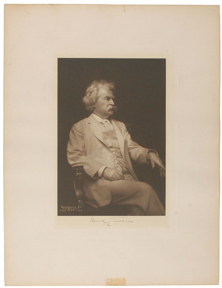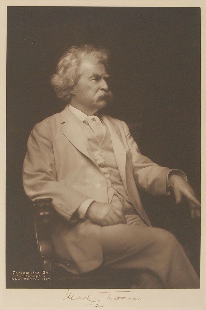 Crystal-clear vintage matte-finish 6.5 x 9.5 photo of Twain in a seated three-quarter-length pose affixed to its original 13 x 17 A. F. Bradley photographer’s mount, crisply signed beneath the image in fountain pen, “Mark Twain.” In fine condition, with light edge toning and toned adhesive remnants to bottom edge. This was part of a series of photographs taken of Clemens in 1907, which were then autographed and sold to raise funds for those affected by the 1906 earthquake in San Francisco. Clemens himself regarded them as the best ever taken of him in his life, and they remain some of the most iconic images of the author extant. Pre-certified John Reznikoff/PSA/DNA and RR Auction COA.