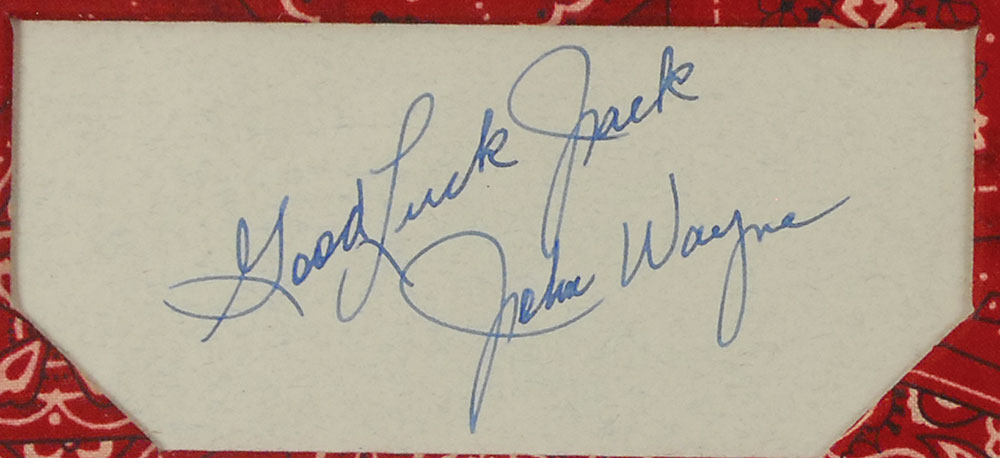 Fairly early vintage fountain pen signature and inscription, “Good luck Jack, John Wayne,” on a 5 x 2 album page. Attractively double-cloth-matted and framed with a nameplate and color image to an overall size of 23 x 18. In very fine condition. Accompanied by a full letter of authenticity from PSA/DNA. RR Auction COA.