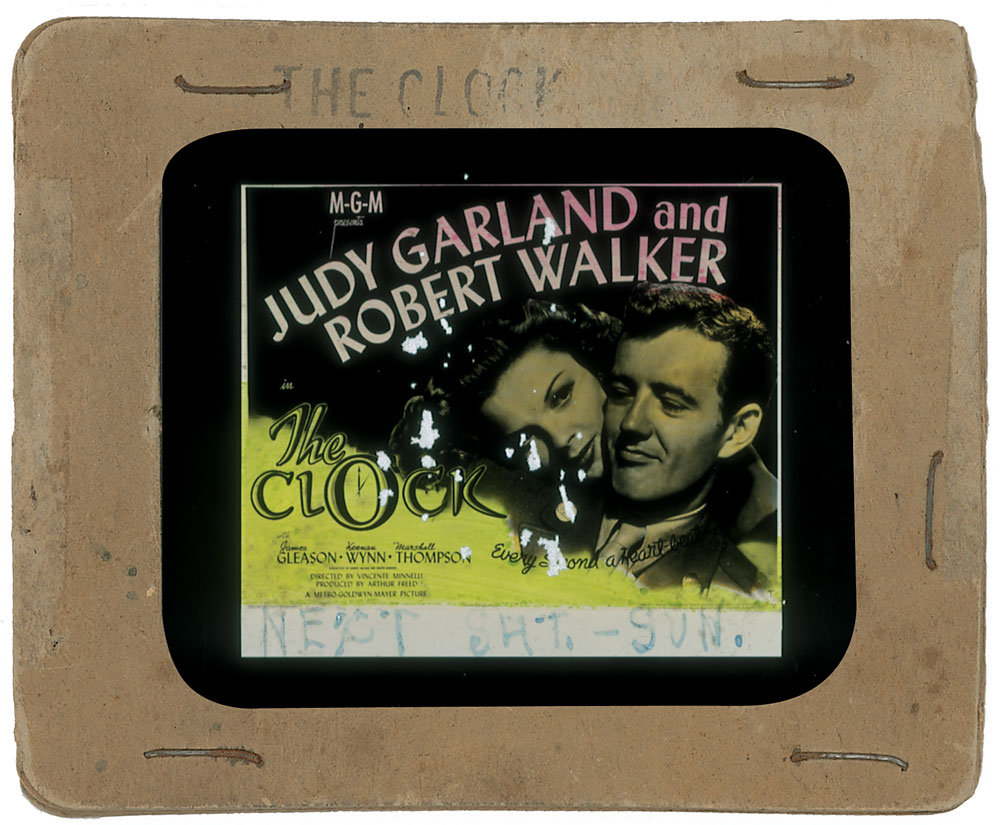 Collection of five color glass slides of movie title cards, 2.75 x 2.25, used to promote upcoming Garland films, all still stapled into their 4 x 3.25 cardboard holders, and each with the title stamped at the top of the cardboard. Film titles are: Little Nellie Kelly, The Clock, Babes in Arms, Broadway Melody of 1938, and Life Begins for Andy Hardy, with four slides having the show dates written along the bottom. Scattered surface loss to color areas of two of the slides, not affecting overall appearance, otherwise fine condition. Because of their fragile materials and heavy use, few examples have survived. RR Auction COA.