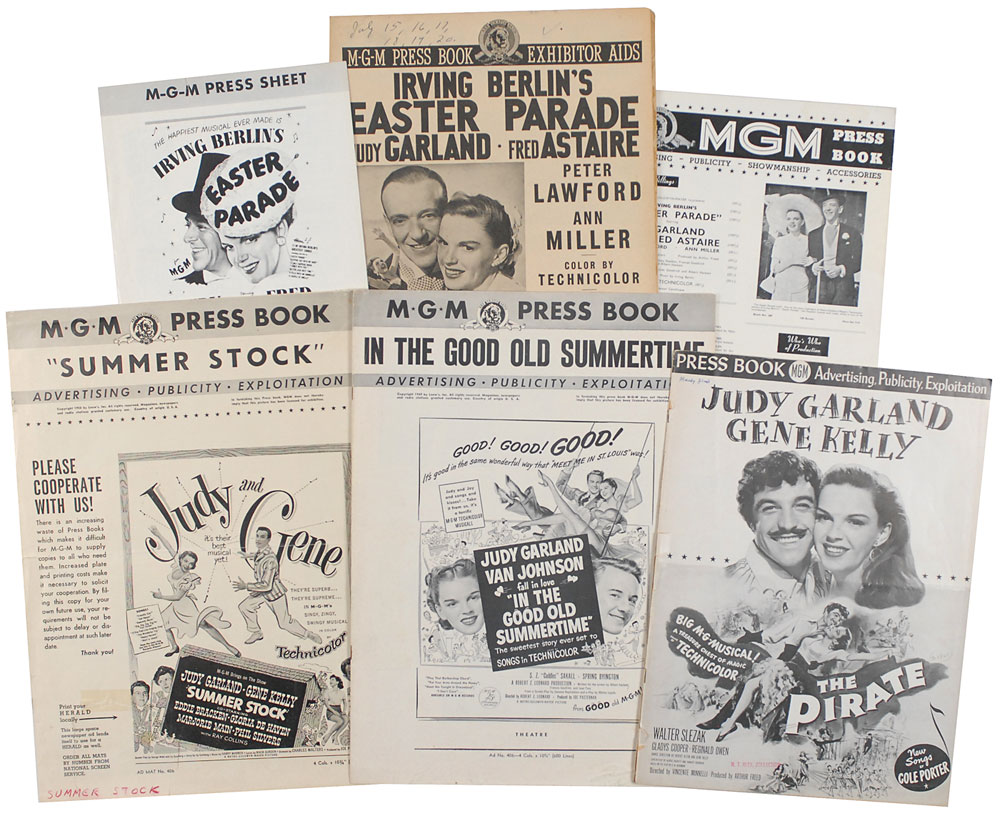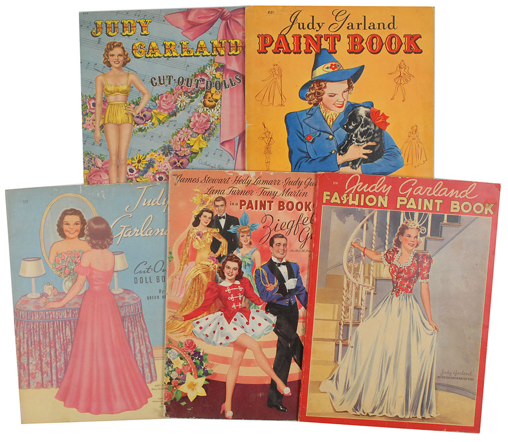 Large collection of Garland promotional material including paint and paper doll books, press books and promotional materials. Items include: 1940 Fashion Paint Book-Whitman #874, partially colored in; 1941 Paint Book published by Whitman, #601, partially colored in; 1941 Ziegfeld Girl Paint Book published by Merrill, #3465; 1940 Garland Cut Out Doll Book by artist Queen Holden published by Whitman, #999, original uncut book; 1945 Judy Garland Cut Out Dolls published by Whitman, #996, original uncut book; press books for Easter Parade (American and British); Meet Me in St. Louis (Mexican); The Clock; The Harvey Girls (American and Spanish); The Pirate; Good Old Summertime; Summer Stock; and other materials for Meet Me in St. Louis, Easter Parade, and The Harvey Girls. Expected age and handling wear, otherwise fine condition. RR Auction COA.