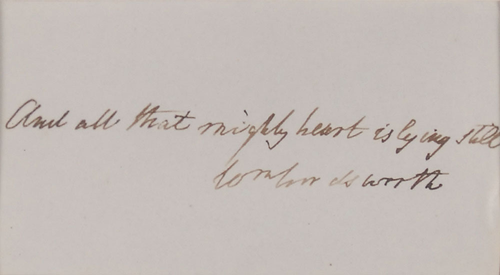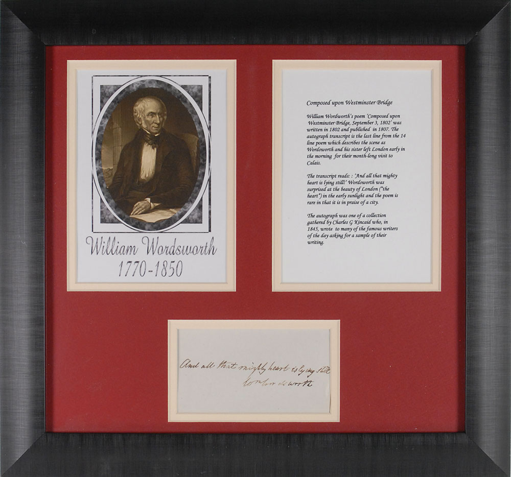 English poet and author (1770–1850) of ‘Lyrical Ballads,’ a collection inspired by the beauty of the English Lake District. Bold AQS on an off-white 5 x 2.75 sheet. Wordsworth pens the closing line of his poem ‘Composed upon Westminster Bridge, September 3, 1802,’ in full: “And all that mighty heart is lying still.” Signed at the conclusion in black ink, “Wm. Wordsworth.” Attractively double-matted and framed with an image of the poet and a typescript describing the poem’s historical background to an overall size of 16.5 x 15. In fine condition. Originates from the collection of Charles G. Kincaid, who acquired a number of autographs from prominent authors in 1845. The poem, written in 1802 but not published until 1807, describes the beauty of the city of London and the River Thames as viewed from Westminster Bridge in the early morning—a departure from the usual literary descriptions of 19th century cities, which focus on the resultant squalor of overpopulation. An exceptionally desirable quote from Wordsworth’s often anthologized poem. RR Auction COA.