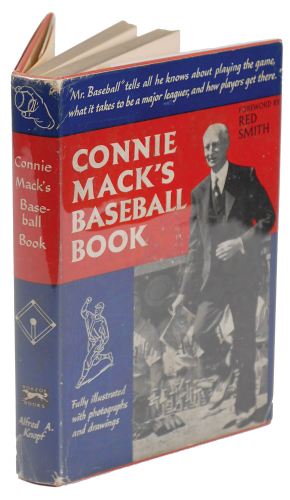 Signed book: Connie Mack’s Baseball Book. First edition. NY: Alfred A. Knopf, 1950. Hardcover with dust jacket, 5.75 x 8.5, 234 pages. Nicely signed in fountain pen on the first free end page. Autographic condition: fine, with a uniform shade of mild toning to page. Book condition: VG/VG-. Orange cloth-covered boards; spine sunned; minimal rubbing to edges; very slightly shelf-cocked; slightly yellowed. Dust jacket in protective mylar sleeve; small chips/tears and creases along edges and folds; mild rubbing; slight yellowing; front flap price-clipped. Pre-certified Steve Grad/PSA/DNA and RR Auction COA.