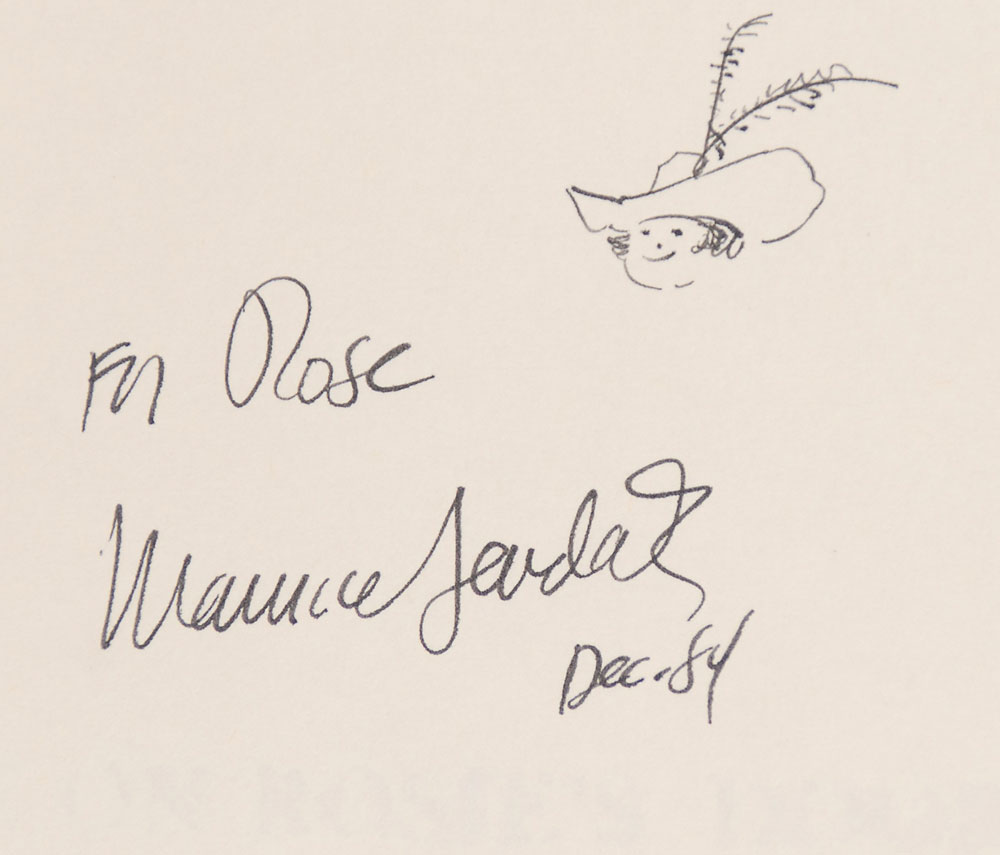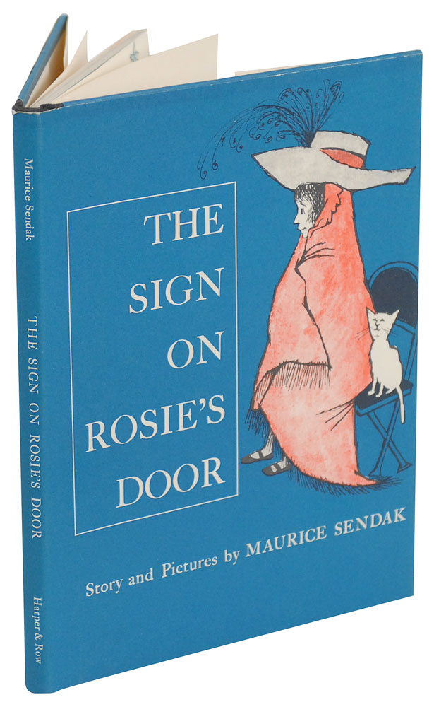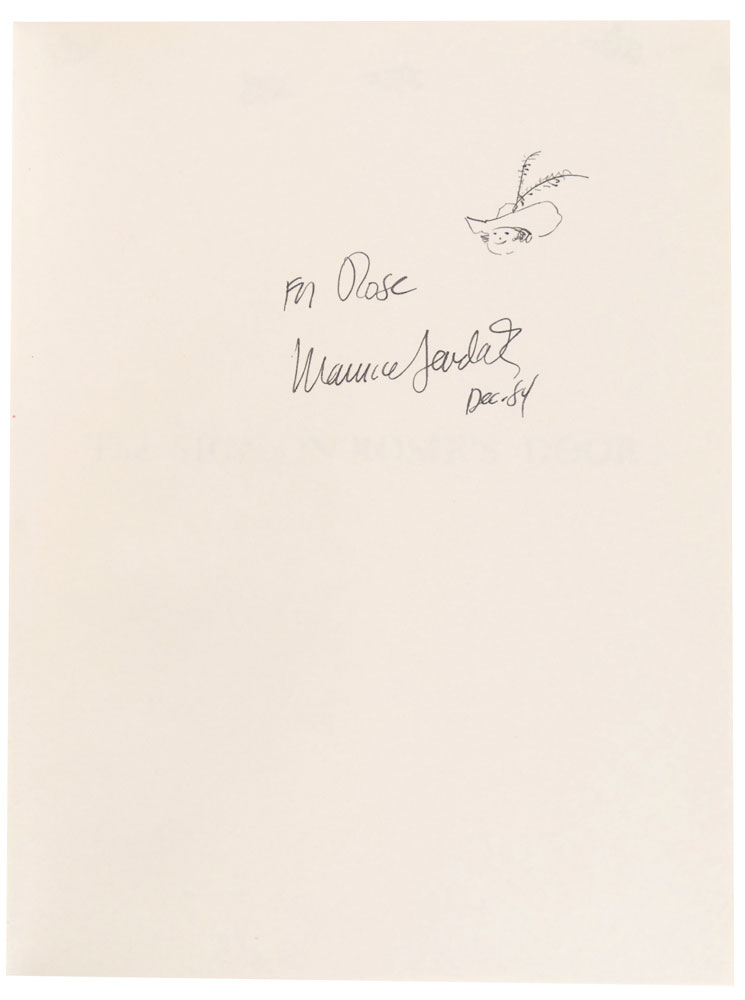 Signed book: The Sign on Rosie’s Door. NY: Harper and Row, 1960. Hardcover with dust jacket, 7 x 9, 47 pages. Signed and inscribed on the first free end page, “For Rose, Maurice Sendak, Dec. 84,” adding a small sketch of Rosie in an elaborate hat. Autographic condition: very fine. Book condition: NF/NF. Black cloth-covered spine and blue illustrated paper-covered boards. Both book and dust jacket have minimal rubbing to edges, otherwise fine condition. Pre-certified PSA/DNA and RR Auction COA.