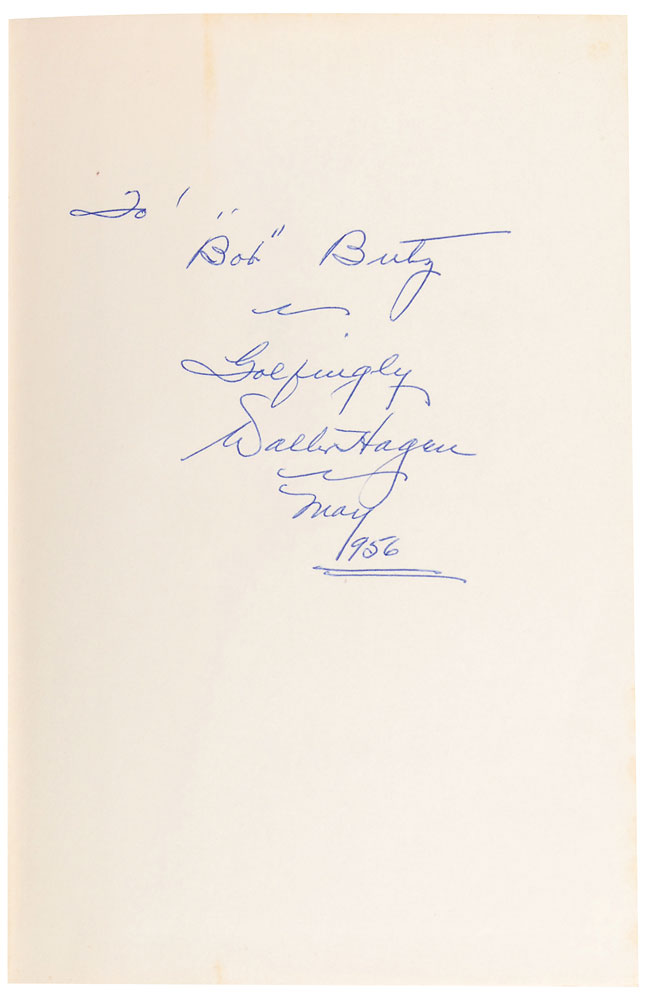 Signed book: The Walter Hagen Story. First edition, first printing. NY: Simon & Schuster, 1956. Hardcover with dust jacket, 6.25 x 9.25, 342 pages. Signed and inscribed on the first free end page, “To ‘Bob’ Butz, Golfingly, Walter Hagen, May 1956.” Autographic condition: fine, with a few small Book condition: VG/VG-. Blue cloth-covered spine and red paper-covered boards; slight wear to corners; minor soiling to textblock edges; and light foxing to endpapers. Dust jacket has small tears and creases along edges; slightly sunned spine; and moderate to heavy foxing. Pre-certified Steve Grad/PSA/DNA and RR Auction COA.