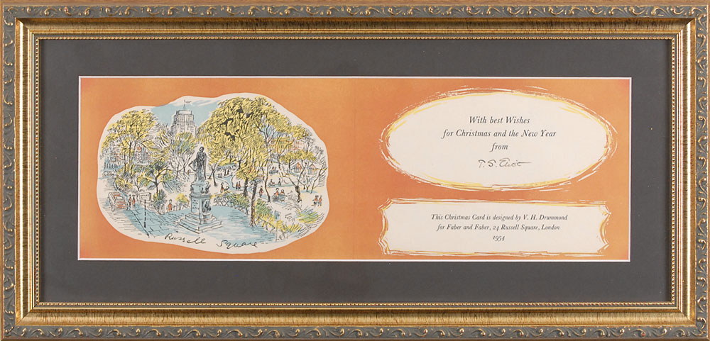 Rare 1954 Christmas card featuring a printed image of Russell Square, measuring 17.5 x 5.75, signed below a printed holiday greeting, “T. S. Eliot.” The card was designed by V. H. Drummond for Eliot’s publisher, Faber and Faber, which had its office in Russell Square. Attractively matted and framed to an overall size of 22.5 x 11. In fine condition. Just the second example of a Christmas card from Eliot we have offered, the other being from a different year. Pre-certified PSA/DNA and RR Auction COA.