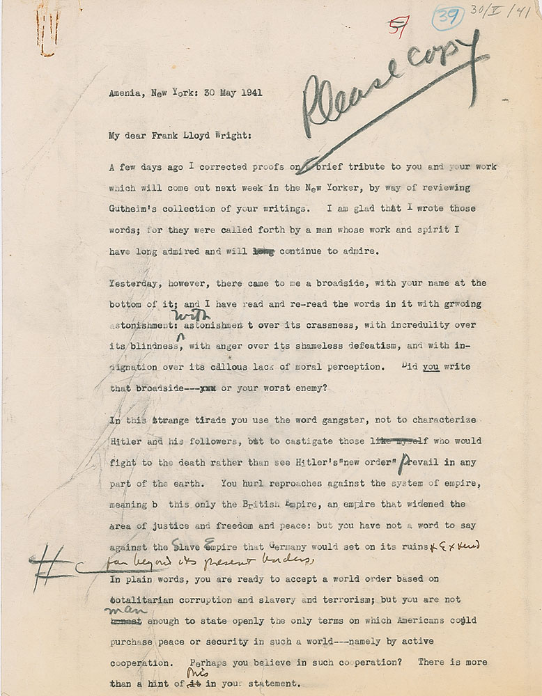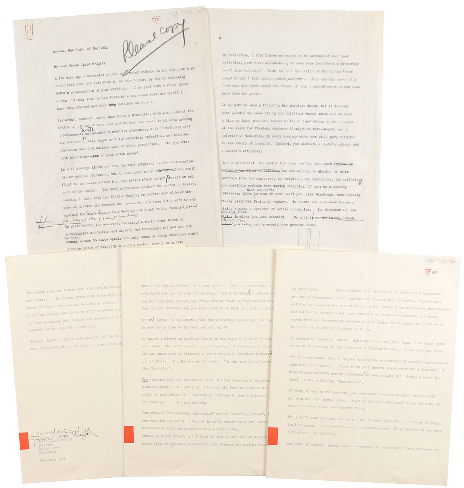 Goodbye, Lewis, I shall read your ‘brief’ in the New Yorker with shame. I shall read it knowing your real opinion is worthless whatever you may write.” Wright added a few punctuation and capitalization corrections throughout the text in his own hand. In fine condition, with intersecting folds and a few unobtrusive creases. Accompanied by Mumford’s retained carbon copy of the equally intense letter to Wright that prompted this response. Published in Frank Lloyd Wright & Lewis Mumford: Thirty Years of Correspondence, Princeton Architectural Press, 2001.