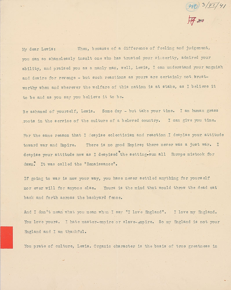 Be ashamed of yourself, Lewis. Some day—but take your time. I am human grass roots in the service of the culture of a beloved country. I can give you time. For the same reason that I despise eclecticism and reaction I despise your attitude toward war and Empire. There is no good Empire; there never was a just war. I despise your attitude now as I despised ‘the setting sun all Europe mistook for dawn.’ It was called the ‘Renaissance’. If going to war is now your way, you have never settled anything for yourself nor ever will for anyone else. Yours is the mind that would throw the dead cat back and forth across the backyard fence. And I don’t mean what you mean when I say ‘I love England.’ I love my England. You love yours. I hate master-empire or slave-empire. So my England is not your England and I am thankful.