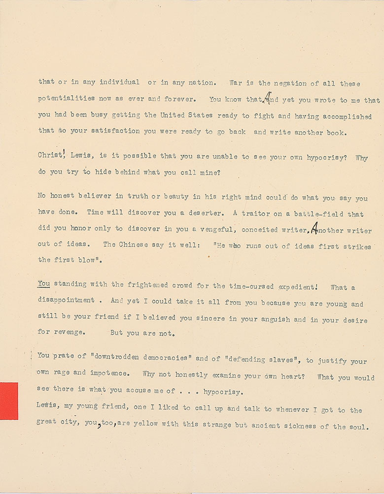 You prate of culture, Lewis. Organic character is the basis of true greatness in that or in any individual or in any nation. War is the negation of all these potentialities now as ever and forever. You know that. And yet you wrote to me that you had been busy getting the United States ready to fight and having accomplished that to your satisfaction you were ready to go back and write another book. Christ! Lewis, is it possible that you are unable to see your own hypocrisy? Why do you try to hide behind what you call mine?