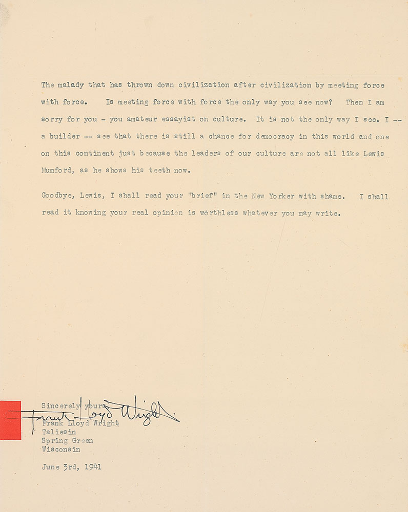 TLS, three pages, 8 x 10, on Wright’s red-block paper, June 3, 1941. Letter to Lewis Mumford. In full: “When, because of a difference of feeling and judgement, you can so shamelessly insult one who has trusted your sincerity, admired your ability, and praised you as a manly man, well, Lewis, I can understand your anguish and desire for revenge—but such reactions as yours are certainly not trustworthy when and wherever the welfare of this nation is at stake, as I believe it to be and as you say you believe it to be.