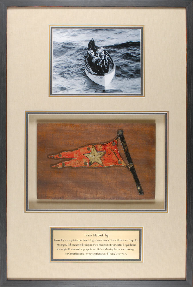 Incredibly scarce flag removed from a Titanic lifeboat. Painted cast bronze flag measures approximately 9.25 x 8. Red and black swallowtail flag and mast features a five-point white star cast in relief in the middle. Flag is screwed into a 13.75 x 9 wooden plaque (note: the screws attaching the plaque to the wooden board are not original to the period). Gorgeously archivally triple-cloth-matted and framed with a photo of a lifeboat and descriptive plaque to an overall size of 22.5 x 33.5. Expected weathering and paint loss, otherwise fine condition. Accompanied by a Carpathia boarding pass, 6 x 9, issued to Istivan Osatai, stamp-dated April 8, 1912, showing Osatai departing New York at noon on April 11 and bound for Budapest. Also included is an analytical report of the flag done by the Institute of Nuclear Research of the Hungarian Academy of Sciences.