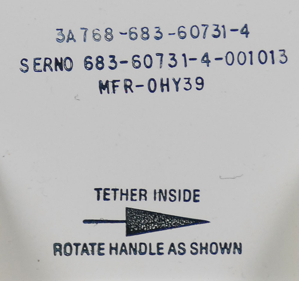Large International Space Station metal tray, 17.5 x 5.5 x 34, with white cloth straps at both ends. White tag affixed inside is dated March 2, 2001, and identifies the tray as “Stowage Tray S-34” and “Part No. 683-60731-4,” and the outside is stenciled with the numbers “3A768-683-60731-4, SERNO 683-60731-4-001013, MFR-0HY39.” In fine condition. RR Auction COA.