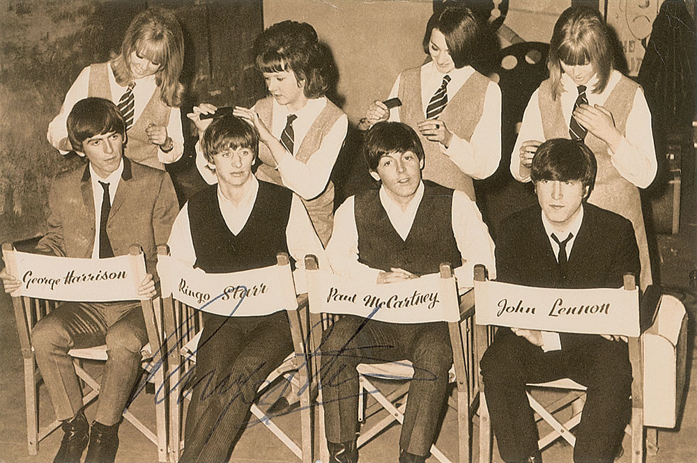 Charming 6 x 4 postcard photo of the Beatles having their hair tended to by some young ladies, signed in black ballpoint. In fine condition, with some light contrast to portions of signature. Pre-certified Roger Epperson/REAL and RR Auction COA.