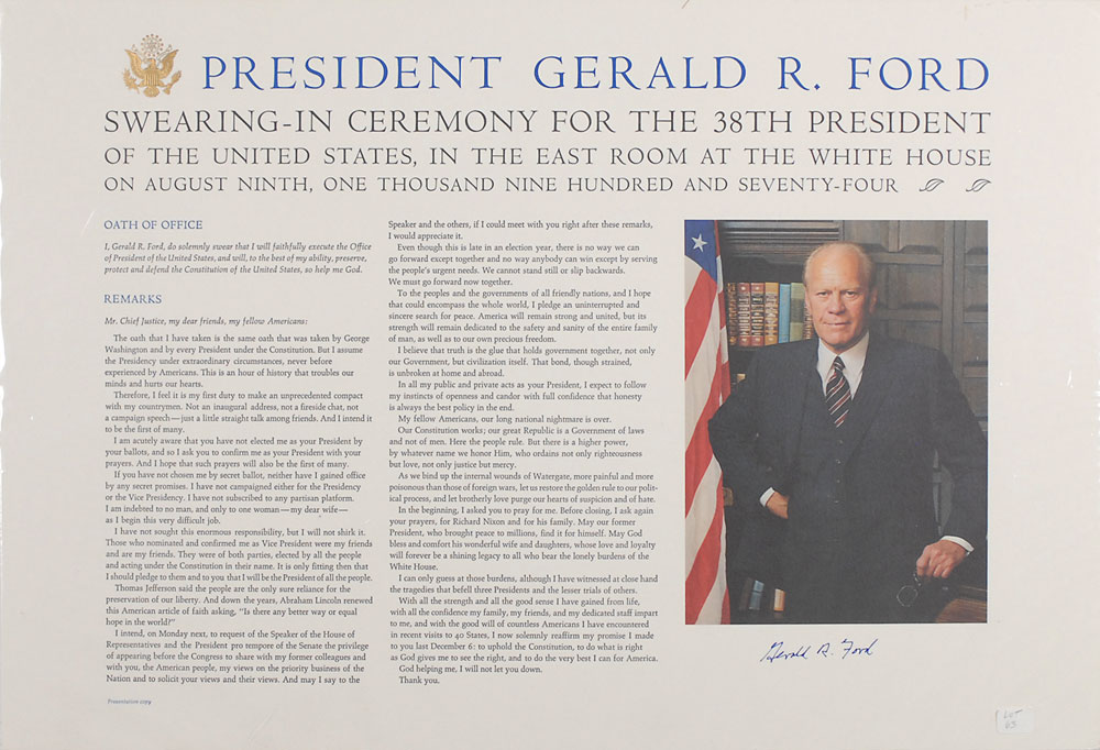 Scarce color 22 x 15 ‘presentation copy’ lithograph broadside bearing Ford’s August 9, 1974, Oath of Office and remarks to the American public, as well as a color image of Ford, signed in blue felt tip, “Gerald R. Ford.” Broadside is removably encapsulated in acid-free Mylar. In very fine condition. At 12:03 p.m. on August 9, 1974, just a half hour after President Nixon’s resignation was made official, Ford took the oath of office in the East Room of the White House, becoming the first president to ever assume the position without being elected. RR Auction COA.
