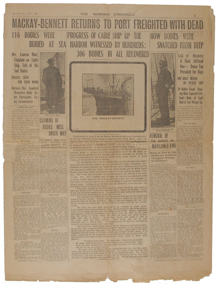 Original section of a May 1, 1912, edition of the Halifax Morning Chronicle, eight pages (3–12), 17 x 22, featuring an image of the Mackay-Bennett and numerous headlines related to the recovery of Titanic victims. Headlines include: “Mackay-Bennett Returns to Port Freighted With Dead,” “116 Bodies Were Buried at Sea,” “Claiming of Bodies Well Under Way,” and “How Bodies Were Snatched From the Deep.” Partial separations to center horizontal fold, some paper loss to edges (leftmost column most affected), and overall brittleness, otherwise very good condition. RR Auction COA.