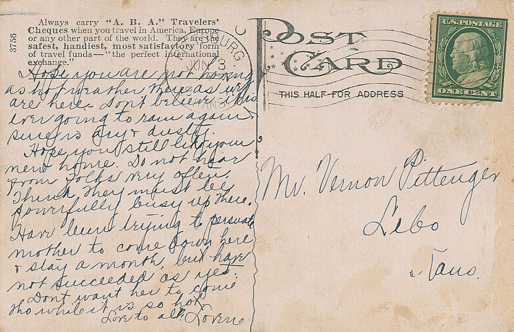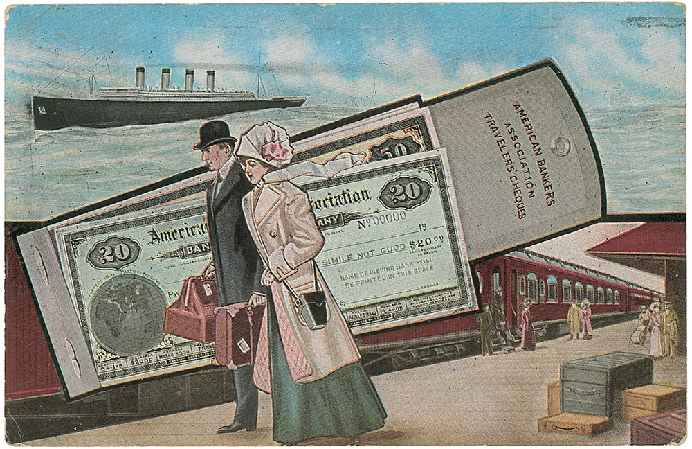 Color postcard produced by the American Bankers Association, featuring an artist’s depiction of a husband and wife traveling by train and steamship, with a book of travelers’ checks in the center. Postmarked June 3, 1911, in Pittsburg, Kansas, and bears a letter in ink, in part: “Hope you are not having as hot weather there as we are here. Don’t believe it is ever going to rain again since is dry & dusty.” Trivial corner tip dings and some light surface loss to the reverse, otherwise fine condition. At the time the Titanic was built, White Star Lines was owned by J. P. Morgan as a subsidiary of his International Mercantile Marine Co., so his financial interests would have been promoted through both White Star Line steamship travel and the sale of traveler’s checks.