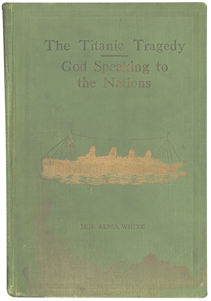 The Titanic Tragedy—God Speaking to the Nations by Alma White. Bound Brook, NJ: The Pentecostal Union, 1913. Green hardcover, 5.25 x 7.75, 211 pages. White argues that the Titanic disaster was caused by God in retribution for a sinful world. In very good condition, with a cracked front hinge, soiling to the lower portion of the front cover, and light damp staining to the bottom of the pages.