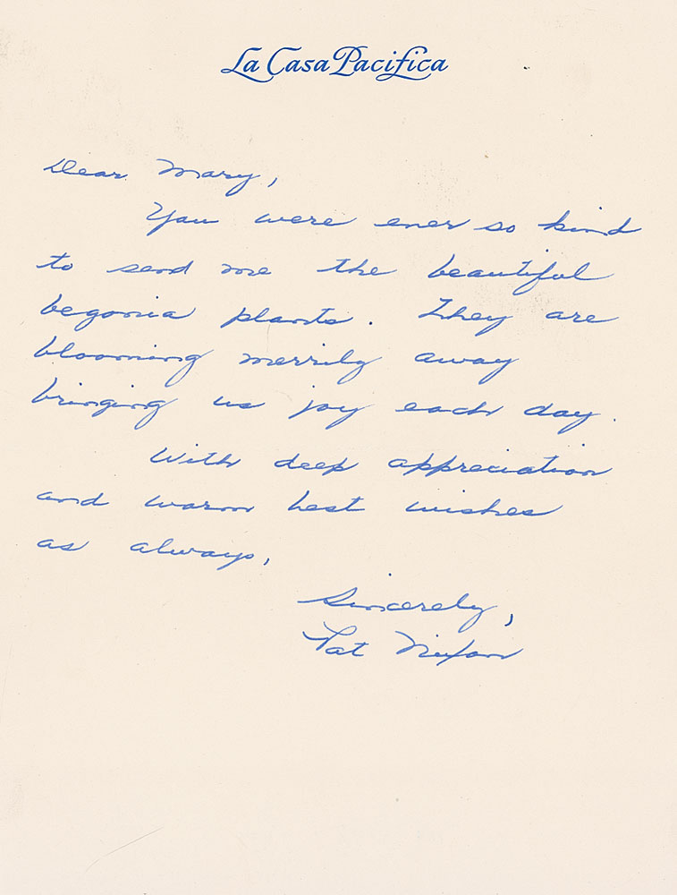 ALS, one page, 5.5 x 7.5, La Casa Pacifica letterhead, no date. Letter to Mary Lazar, wife of Irving Paul ‘Swifty’ Lazar. In part: “You were ever so kind to send me the beautiful begonia plants. They are blooming merrily away bringing us joy each day.” In fine condition. RR Auction COA.