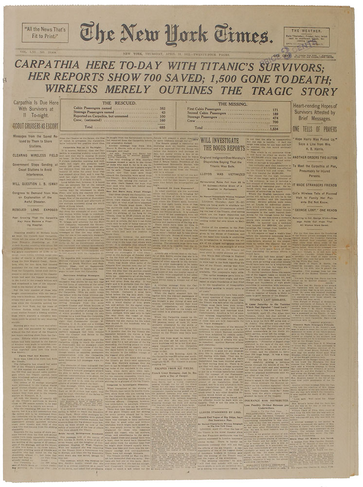 Original and complete April 18, 1912, edition of The New York Times, 17 x 23, with the banner headline reading, “Carpathia here To-Day with Titanic’s Survivors; Her Reports Show 700 Saved; 1500 Gone To Death; Wireless Merely Outlines the Tragic Story.” Uniform toning, central horizontal fold, a price stamp to top, and a bit of mild foxing and separations to edges, otherwise fine condition. RR Auction COA.