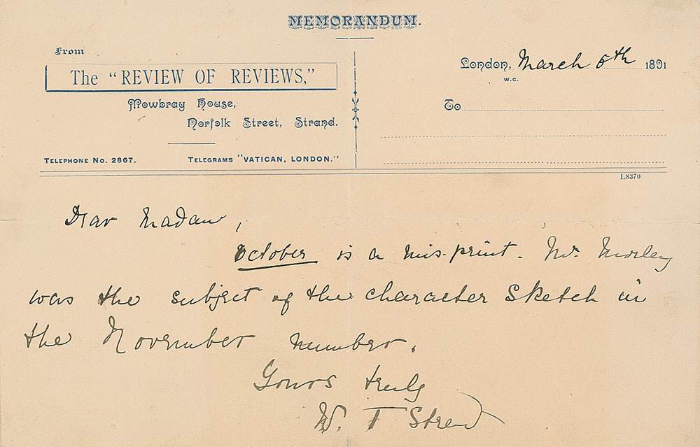 Journalist (1849–1912), assistant editor of the Pall Mall Gazette, and founder of The Review of Reviews who perished in the Titanic disaster. ALS signed “W. T. Stead,” one page, 8 x 5, Memorandum from the ‘Review of Reviews’ letterhead, March 5, 1891. Brief letter to an unidentified woman. In full: “October is a mis-print. Mr. Morley was the subject of the character sketch in the November number.” In fine condition, with central horizontal and vertical folds, and a light block of toning over signature and portion of text. RR Auction COA.