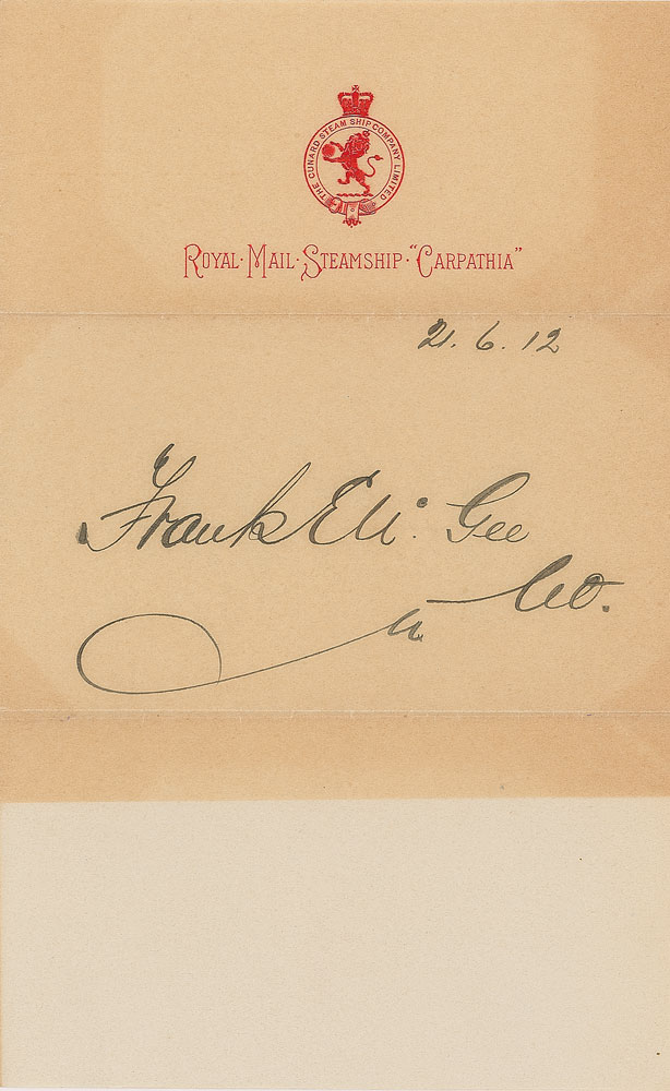 Ship’s surgeon on board the Carpathia, who tended to Titanic survivors. Vintage ink signature, “Frank E. McGee, CO., 2.6.12,” on an off-white 5 x 8 sheet of embossed Carpathia stationery. In fine condition, with uniform toning from previous display. RR Auction COA.