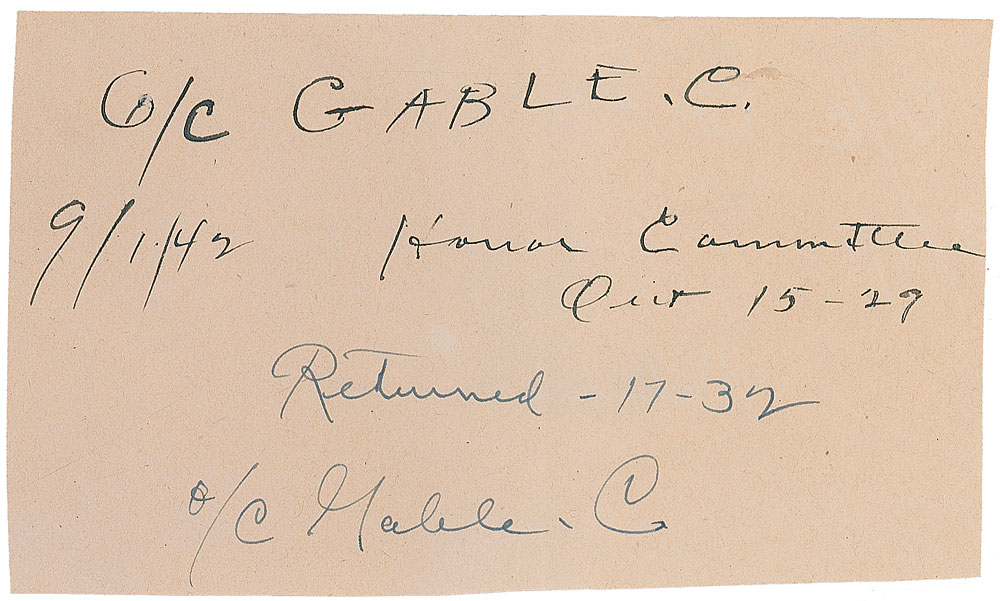 Manuscript 6.25 x 3.75 pass issued to Gable while attending Officer Candidate School in the Army, with Gable writing prior to leaving “O/C Gable C., 9/1/42, Honor Committee, Out 15-27” and then upon his return, “Returned-17-32, O/C Gable C.” In fine condition. The pass represents a special dispensation Gable received to attend a meeting of the honor committee, a group charged with enforcing rules of honor and conduct that his classmates had elected him to. Pre-certified PSA/DNA and RR Auction COA.